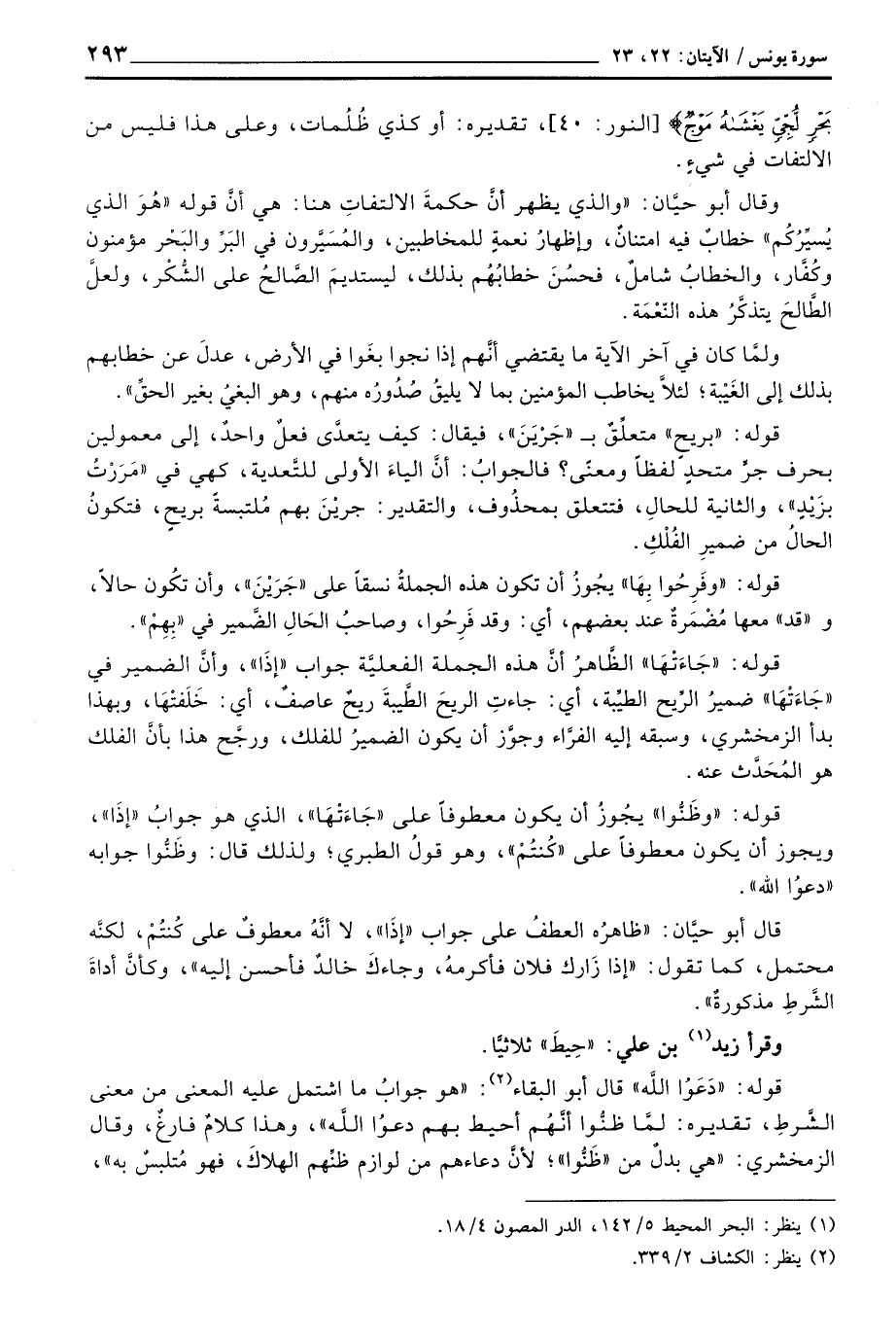 وقال أبو حيَّان: «والذي يظهر أنَّ حكمةَ الالتفاتِ هنا: هي أنَّ قوله {هُوَ الذي يُسَيِّرُكُمْ} خطابٌ فيه امتنانٌ، وإظهارُ نعمةٍ للمخاطبين، والمُسَيَّرون في البَرِّ والبَحْر مؤمنون وكُفَّار، والخطابُ شاملٌ، فحسُنَ خطابُهُم بذلك، ليستديمَ الصَّالحُ على الشُّكْر، ولعلَّ الطَّالحَ يتذكَّرُ هذه النّعْمَة.