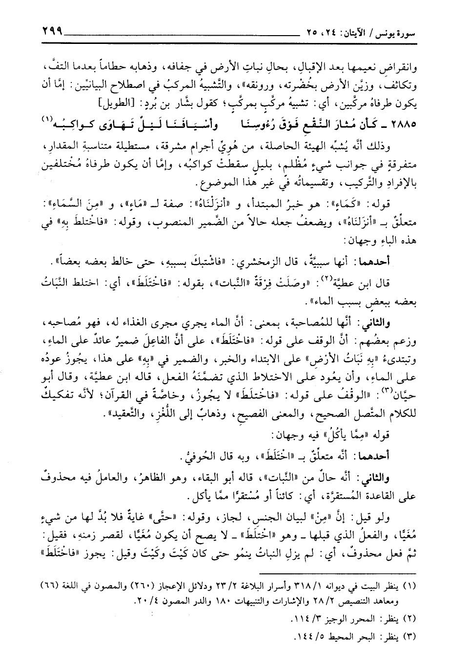 والثاني: أنَّها للمُصاحبة، بمعنى: أنَّ الماء يجري مجرى الغذاء له، فهو مُصاحبه، وزعم بعضُهم: أنَّ الوقف على قوله: «فاختلط» ، على أنَّ الفاعِلَ ضميرٌ عائدٌ على الماءِ، وتبتدىءُ «بِهِ نَبَاتُ الأرض» على الابتداء والخبر، والضمير في «بِهِ» على هذا، يجُوزُ عودُه على الماءِ، وأن يعُود على الاختلاط الذي تضمَّنَهُ الفعل، قاله ابن عطيَّة، وقال أبو حيَّان: «الوقْفُ على قوله:» فاخْتلَطَ «لا يجُوزُ، وخاصَّةً في القرآن؛ لأنَّه تفكيكٌ للكلام المتَّصل الصحيح، والمعنى الفصيحِ، وذهابٌ إلى اللُّغْزِ، والتَّعقيد» .