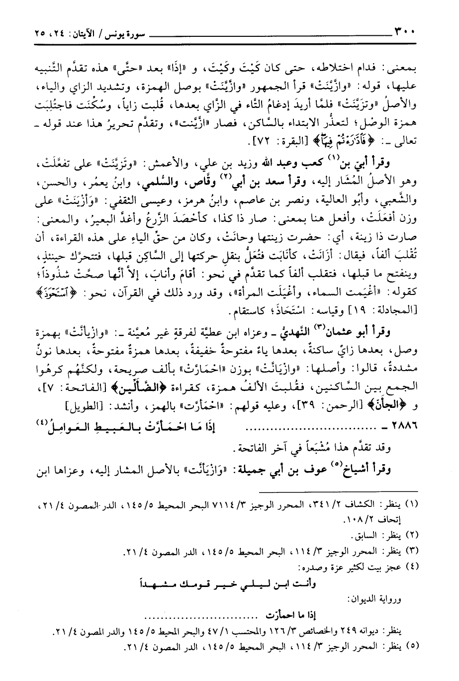 وقرأ أبيّ بن كعب وعبد الله وزيد بن علي، والأعمش: «وتَزيَّنَتْ» على تفعَّلَتْ، وهو الأصلُ المُشَار إليه، وقرأ سعد بن أبي وقَّاص، والسُّلمي، وابنُ يعمُر، والحسن، والشَّعبي، وأبُو العالية، ونصر بن عاصم، وابنُ هرمز، وعيسى الثقفي: «وَأزْيَنَتْ» على وزن أفعَلَتْ، وأفعل هنا بمعنى: صار ذا كذا، كأحْصَدَ الزَّرعُ وأغدَّ البعيرُ، والمعنى: صارت ذا زينة، أي: حضرت زينتها وحانَتْ، وكان من حقِّ الياءِ على هذه القراءة، أن تُقْلبَ ألفاً، فيقال: أزَانَتْ، كأنَابَت فتُعَلُّ بنقلِ حركتها إلى السَّاكِن قبلها، فتتحرَّك حينئذٍ، وينفتح ما قبلها، فتقلب ألفاً كما تقدَّم في نحو: أقامَ وأنابَ، إلاَّ أنَّها صحَّتْ شذُوذاً؛ كقوله: «أغْيَمت السماء، وأغْيَلَت المرأة» ، وقد ورد ذلك في القرآن، نحو: {استحوذ} [المجادلة: 19] وقياسه: اسْتَحَاذَ؛ كاستقام.