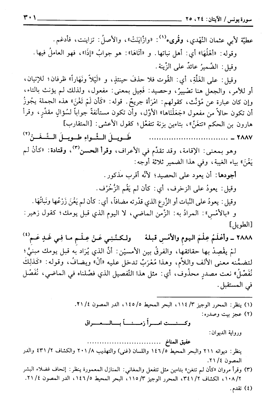 وقيل: على الغَلَّةِ، أي: القُوت فلا حذفَ حينئذٍ، و «لَيْلاً ونَهَاراً» ظرفان؛ للإتيان، أو للأمر، والجعل هنا تصْييرٌ، وحصيد: فَعِيل بمعنى: مفعول، ولذلك لم يؤنث بالتاء، وإن كان عبارة عن مُؤنَّث، كقوله: أمْرَأة جريحٌ. قوله: «كَأَن لَّمْ تَغْنَ» هذه الجملة يجُوزُ أن تكون حالاً من مفعول «جَعَلْنَاها» الأوَّل، وأن تكون مستأنفةٌ جواباً لسُؤالٍ مقدَّرٍ، وقرأ هارون بن الحكم «تتغَنَّ» ، بتاءين بنزنة تتفعَّل؛ كقول الأعشى: [المتقارب]