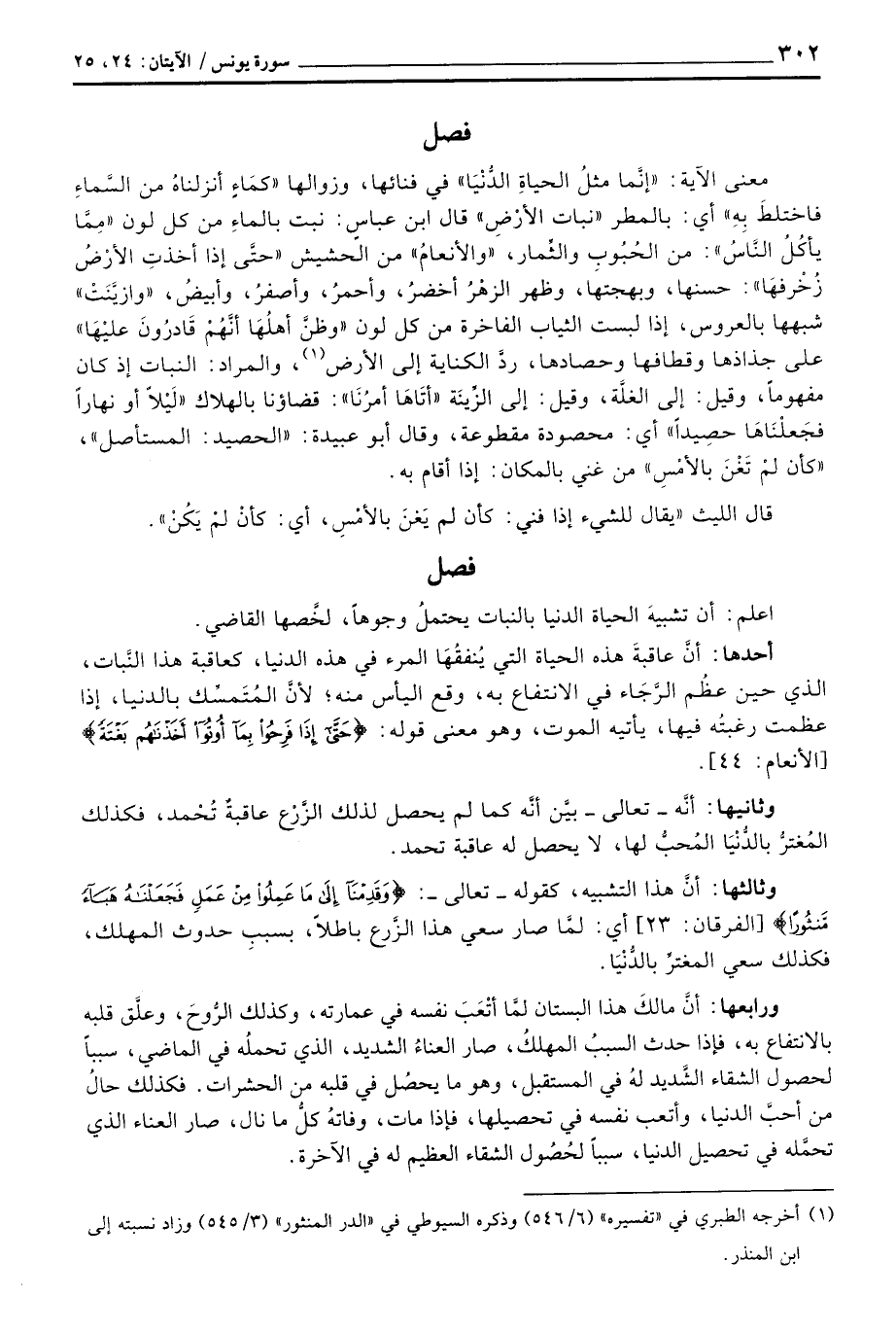 أحدها: أنَّ عاقبةَ هذه الحياة التي يُنفقُهَا المرء في هذه الدنيا، كعاقبة هذا النَّبات، الذي حين عظُم الرَّجَاء في الانتفاع به، وقع اليأس منه؛ لأنَّ المُتَمسِّك بالدنيا، إذا عظمت رغبتُه فيها، يأتيه الموت، وهو معنى قوله: {حتى إِذَا فَرِحُواْ بِمَآ أوتوا أَخَذْنَاهُمْ بَغْتَةً} [الأنعام: 44] .