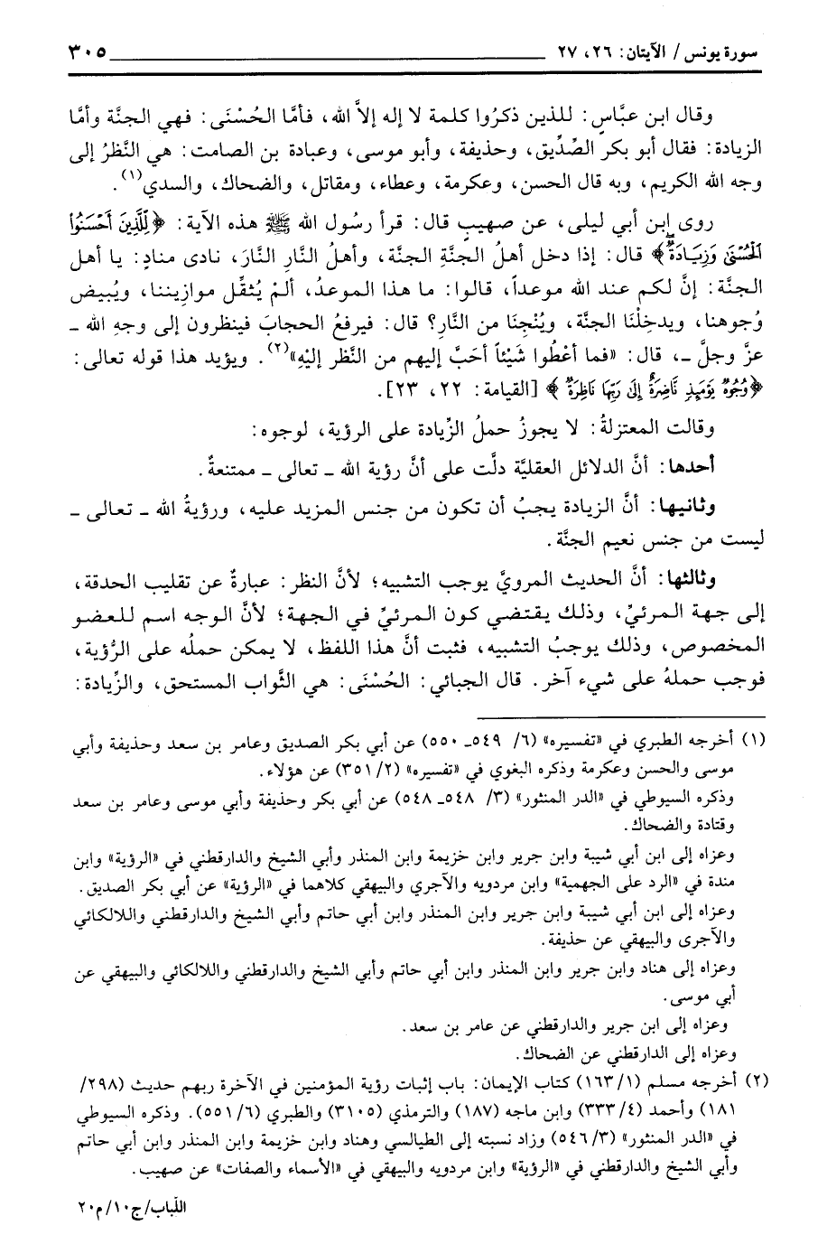 وثالثها: أنَّ الحديث المرويَّ يوجب التشبيه؛ لأنَّ النظر: عبارةٌ عن تقليب الحدقة، إلى جهة المرئيِّ، وذلك يقتضي كون المرئيِّ في الجهة؛ لأنَّ الوجه اسم للعضو المخصوص، وذلك يوجبُ التشبيه، فثبت أنَّ هذا اللفظ، لا يمكن حملُه على الرُّؤية، فوجب حملهُ على شيء آخر. قال الجبائي: الحُسْنَى: هي الثَّواب المستحق، والزِّيادة: