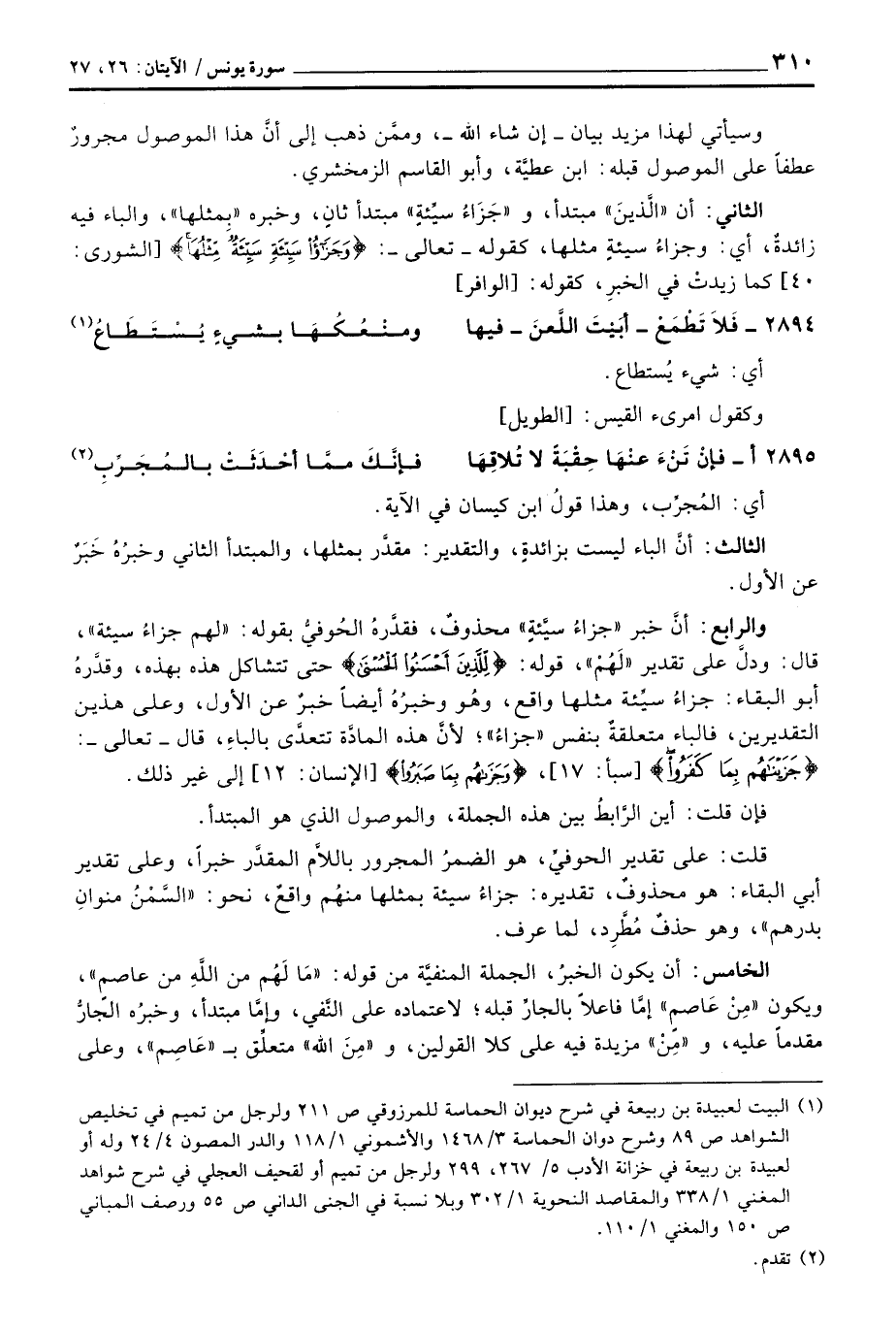والرابع: أنَّ خبر «جزاء سيَّئةٍ» محذوفٌ، فقدَّرهُ الحُوفيُّ بقوله: «لهم جزاءُ سيئة» ، قال: ودلَّ على تقدير «لَهُمْ» ، قوله: {لِّلَّذِينَ أَحْسَنُواْ الحسنى} حتى تتشاكل هذه بهذه، وقدَّرهُ أبو البقاء: جزاءُ سيِّئة مثلها واقع، وهُو وخبرُهُ أيضاً خبرٌ عن الأول، وعلى هذين التقديرين، فالباء متعلقةٌ بنفس «جزاءُ» ؛ لأنَّ هذه المادَّة تتعدَّى بالباءِ، قال - تعالى -: {جَزَيْنَاهُمْ بِمَا كَفَرُواْ} [سبأ: 17] ، {وَجَزَاهُمْ بِمَا صَبَرُواْ} [الإنسان: 12] إلى غير ذلك.
