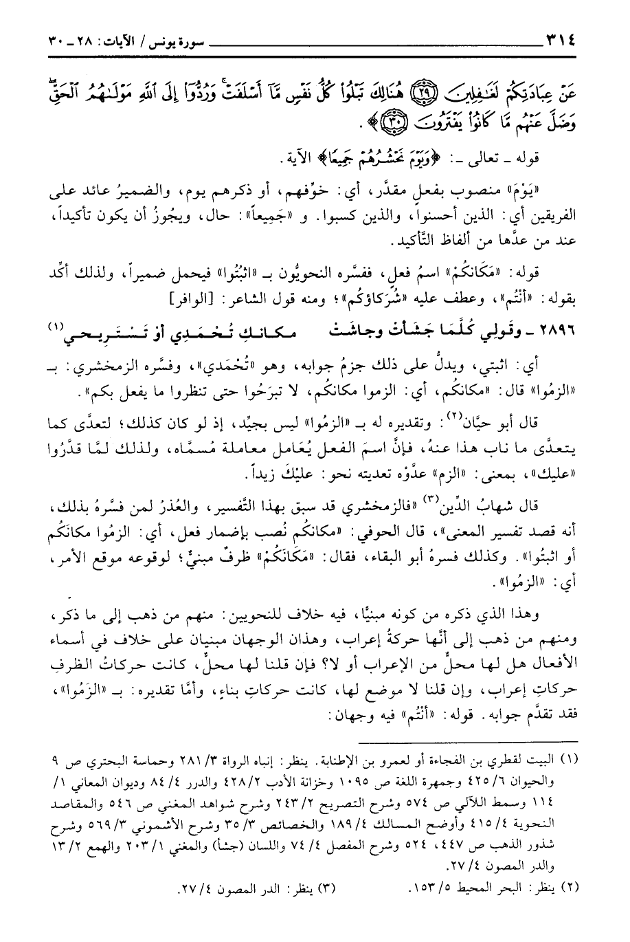 قال شهابُ الدِّين» فالزمخشري قد سبق التَّفسير، والعُذرُ لمن فسَّرهُ بذلك، أنه قصد تفسير المعنى «، قال الحوفي:» مكانكُم نُصب بإضمار فعل، أي: الزمُوا مكانَكُم أو اثبُتوا «. وكذلك فسرهُ أبو البقاء، فقال:» مَكَانَكُمْ «ظرفٌ مبنيٌّ؛ لوقوعه موقع الأمر، أي:» الزمُوا «.