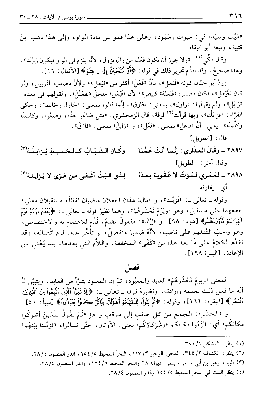 وقوله - تعالى -: «فَزيَّلْنا» ، و «قال» هذان الفعلان ماضيان لفظاً، مستقبلان معنًى؛ لعطفهما على مستقبل، وهو «ويَوْمَ نَحْشُرهُمْ» ، وهما نظيرُ قوله - تعالى -: {يَقْدُمُ قَوْمَهُ يَوْمَ القيامة فَأَوْرَدَهُمُ} [هود: 98] . و «إِيَّانَا» : مفعولٌ مقدمٌ، قُدِّم للاهتمام به والاختصاص، وهو واجبُ التَّقديم على ناصبه؛ لأنَّه ضميرٌ منفصلٌ، لو تأخَّر عنه، لزم اتِّصاله، وقد تقدَّم الكلامُ على ما بعد هذا من «كَفَى» المخففة، واللاَّم التي بعدها، بما يُغْنِي عن الإعادة. [البقرة198] .