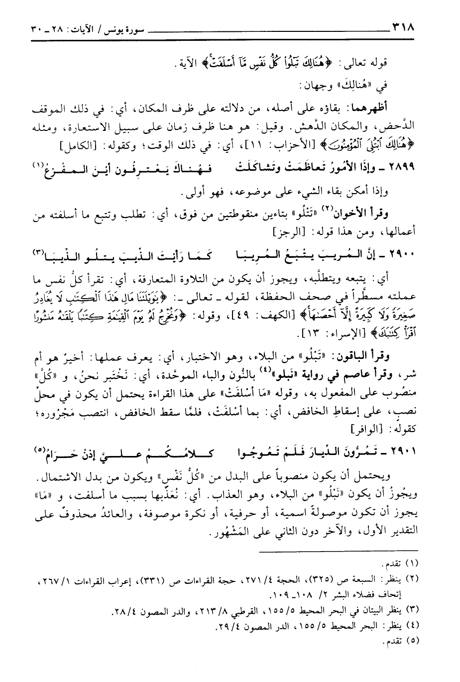 وقرأ الباقون: «تَبْلُوا» من البلاء، وهو الاختبار، أي: يعرف عملها: أخيرٌ هو أم شر، وقرأ عاصم في رواية «نَبلو» بالنُّون والباء الموحَّدة، أي: نَخْتَبر نحنُ، و «كُلَّ» منصُوب على المفعول به، وقوله «مَا أسْلفَتْ» على هذا القراءة يحتمل أن يكون في محلِّ نصبٍ، على إسقاطِ الخافض، أي: بما أسْلفَتْ، فلمَّا سقط الخافض، انتصب مَجْرُوره؛ كقوله: [الوافر]