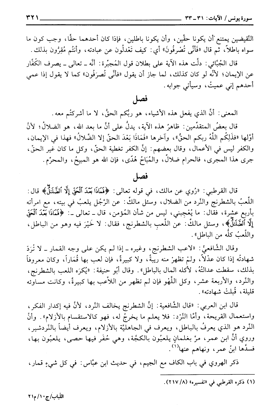قال القرطبي: «رُوي عن مالك، في قوله تعالى: {فَمَاذَا بَعْدَ الحق إِلاَّ الضلال} قال اللَّعبُ بالشطرنج والنَّرد من الضلال، وسئل مالكٌ: عن الرَّجُل يلعبُ في بيته، مع امرأته بأربعة عشرة، فقال: ما يُعْجِبني، ليس من شأن المُؤمن، قال - تعالى -: {فَمَاذَا بَعْدَ الحق إِلاَّ الضلال} ، وسئل مالكٌ: عن اللَّعبِ بالشطرنج، فقال: لا خَيْرَ فيه وهو من الباطل، واللَّعبُ كلُّه من الباطل» .