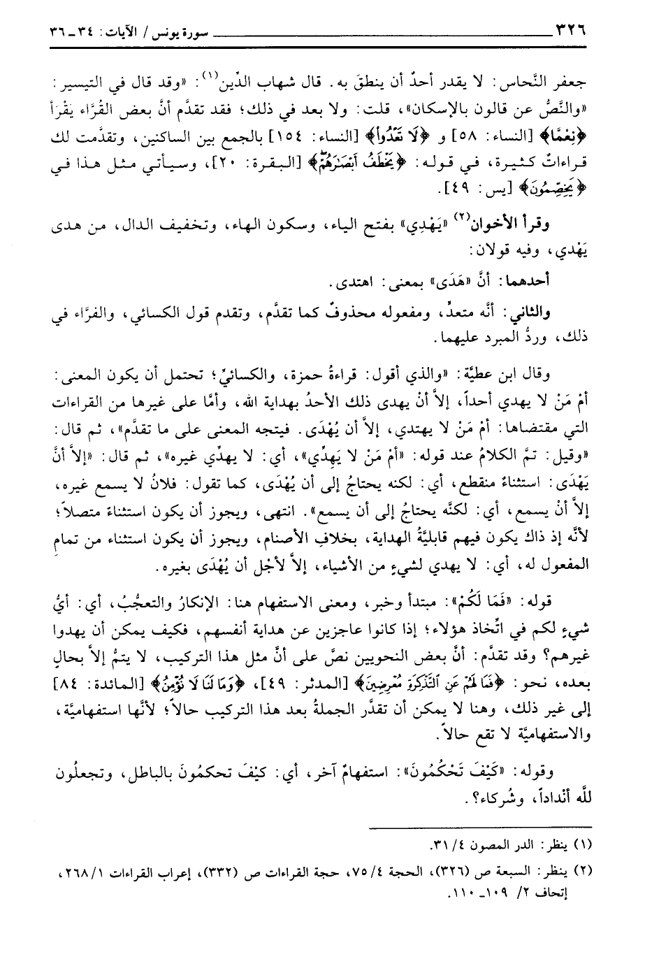 وقال ابن عطيَّة:» والذي أقول: قراءةُ حمزة، والكسائيُّ؛ تحتمل أن يكون المعنى: أمْ مَنْ لا يهدي أحداً، إلاَّ أنْ يهدي ذلك الأحدُ بهداية الله، وأمَّا على غيرها من القراءات التي مقتضاها: أمْ مَنْ لا يهتدي، إلاَّ أنْ يُهْدَى. فيتجه المعنى على ما تقدَّم «، ثم قال:» وقيل: تمَّ الكلامُ عند قوله: «أمْ مَنْ لا يَهَدِّي» ، أيك لا يهدِّي غيره «، ثم قال:» إلاَّ أنَّ يَهْدَى: استثناءٌ منقطع، أي: لكنه يحتاجُ إلى أن يُهْدَى، كما تقول: فلانُ لا يسمع غيره، إلاَّ أنْ يسمع، أي: لكنَّه يحتاجُ إلى أن يسمع «.