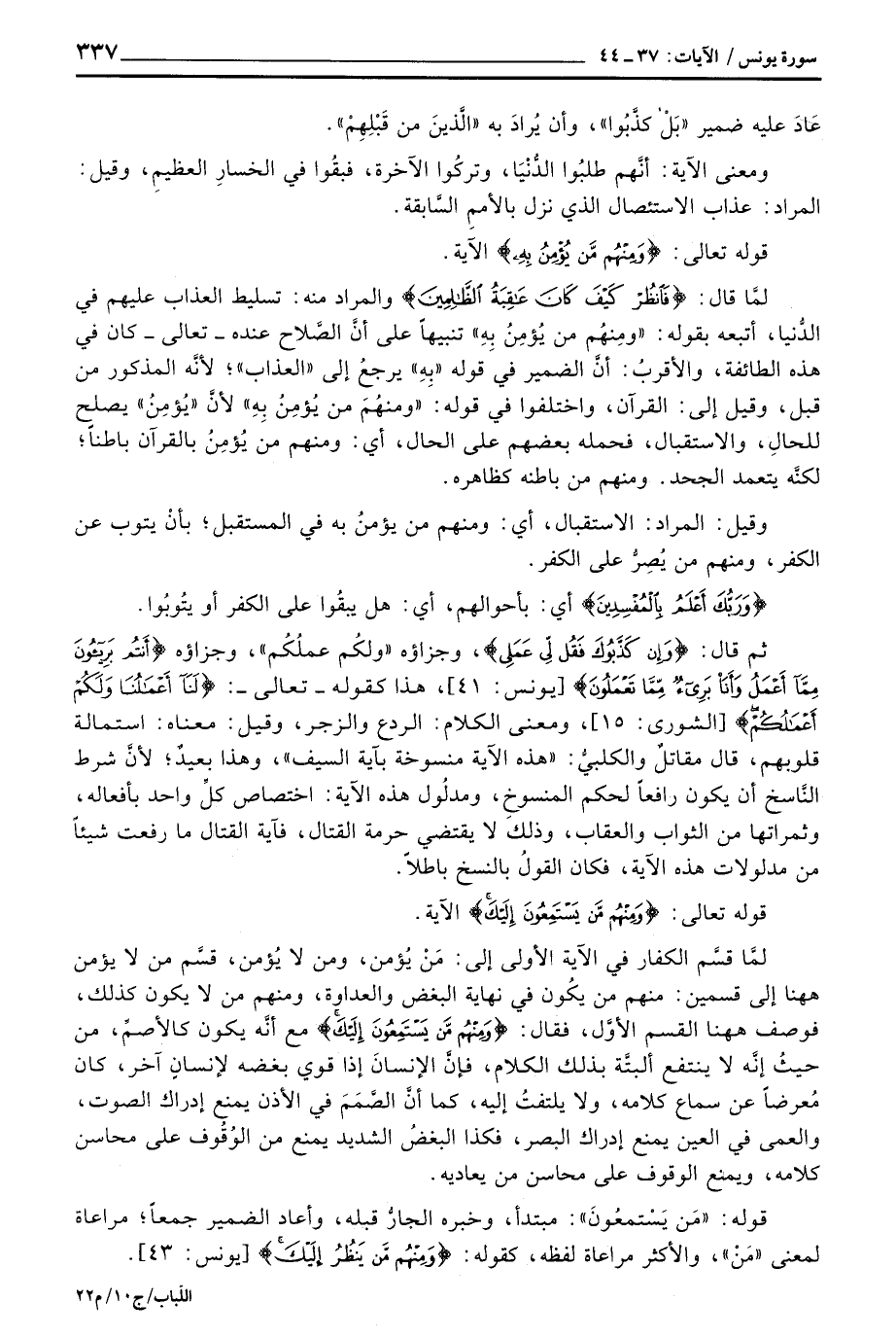 قوله تعالى: {وَمِنهُمْ مَّن يُؤْمِنُ بِهِ} لأنَّ «يُؤمِنُ» يصلح للحالِ، والاستقبال، فحمله بعضهم على الحال، أي: ومنهم من يُؤمِنُ بالقرآن باطناً؛ لكنَّه يتعمد الجحد. ومنهم من باطنه كظاهره.
