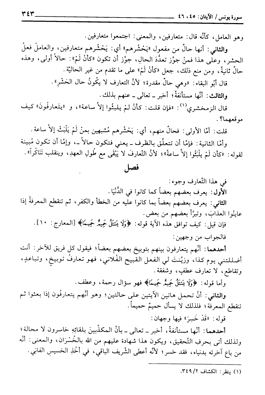 وأمَّا الثانية: فإمَّا أن تتعلَّق بالظرف - يعني فتكون حالاً -، وإمَّا أن تكون مُبينة لقوله: {كَأَن لَّمْ يلبثوا إِلاَّ سَاعَةً} ؛ لأنَّ التَّعارفَ لا يَبْقَى مع طُولِ العهدِ، وينقلب تَنَاكُراً «.