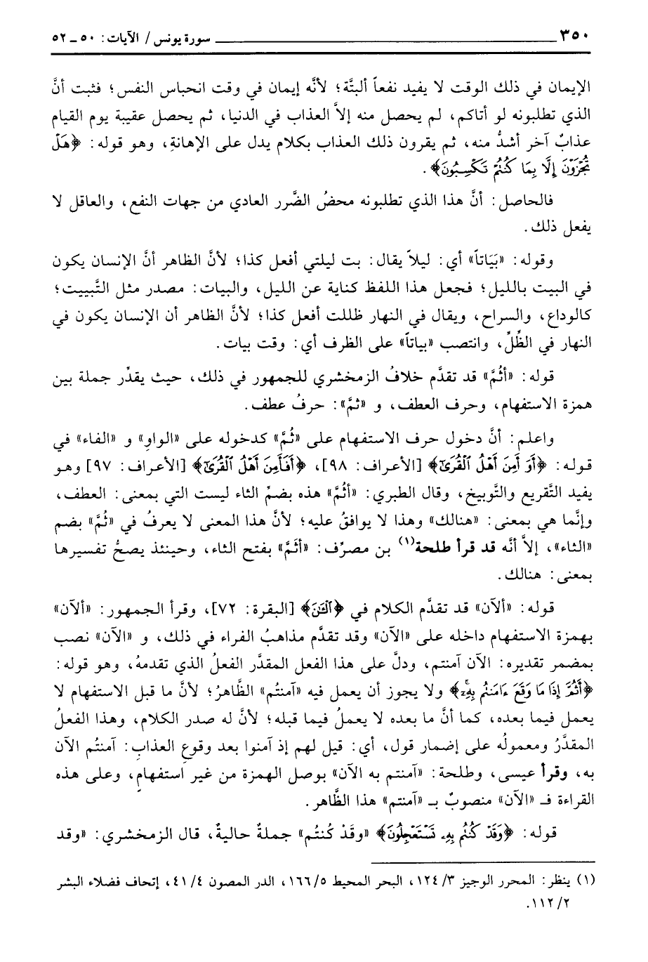 واعلم: أنَّ دخول حرف الاستفهام على» ثُمَّ «كدخوله على» الواوِ «و» الفاء «في قوله: {أَوَ أَمِنَ أَهْلُ القرى} [الأعراف: 98] ، {أَهْلُ القرى} [الأعراف: 97] وهو يفيد التَّقريع والتَّوبيخ، وقال الطبري:» أثُمَّ «هذه بضمِّ الثاء ليست التي بمعنى: العطف، وإنَّما هي بمعنى:» هنالك «وهذا لا يوافقُ عليه؛ لأنَّ هذا المعنى لا يعرفُ في» ثُمَّ «بضم» الثاء «، إلاَّ أنَّه قد قرأ طلحة بن مصرِّف:» أثَمَّ «بفتح الثاء، وحينئذ يصحُّ تفسيرها بمعنى: هنالك.