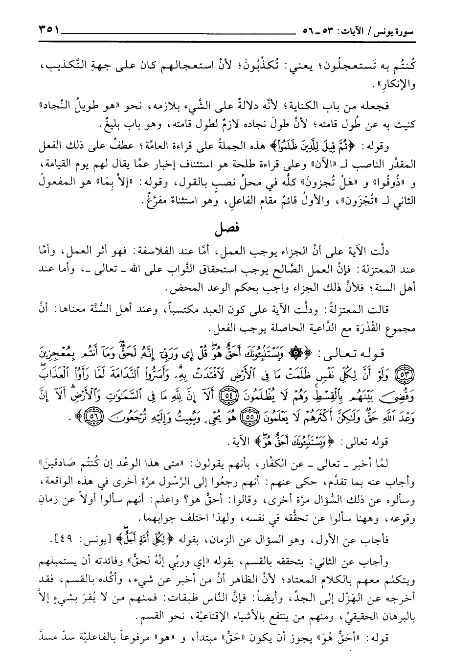 وأجاب عن الثاني: بتحققه بالقسم، بقوله {إِي وربي إِنَّهُ لَحَقٌّ} وفائدته أن يستميلهم ويتكلم معهم بالكلام المعتاد؛ لأنَّ الظاهر أنَّ من أخبر عن شيء، وأكَّده بالقسم، فقد أخرجه عن الهَزل إلى الجدِّ، وأيضاً: فإنَّ النَّاس طبقات: فمنهم من لا يُقِرّ بشيءٍ إلاَّ بالبرهان الحقيقيِّ، ومنهم من ينتفع بالأشياء الإقناعيَّة، نحو القسم.