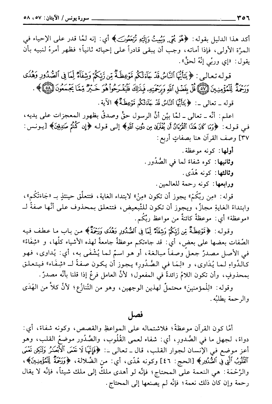 أمَّا كون القرآن موعظةً؛ فلاشتماله على المواعظِ والقصص، وكونه شفاءً، أي: دواءً، لجهل ما في الصُّدورِ، أي: شفاء لعمى القُلُوب، والصُّدُور موضعُ القلب، وهو أعز موضع في الإنسان لجواز القلب، قال - تعالى -: {فَإِنَّهَا لاَ تَعْمَى الأبصار ولكن تعمى القلوب التي فِي الصدور} [الحج: 46] وكونه هُدًى، أي: من الضَّلالة، {وَرَحْمَةٌ لِّلْمُؤْمِنِينَ} ، والرَّحْمَة: هي النعمة على المحتاج؛ فإنَّه لو أهدى ملكٌ إلى ملك شيئاً، فإنَّه لا يقال رحمة وإن كان ذلك نعمة؛ فإنَّه لم يصنعها إلى المحتاج.