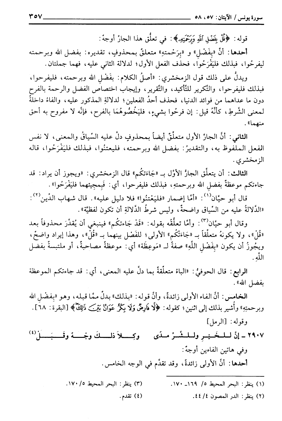 ويدلُّ على ذلك قول الزمخشري: «أصلُ الكلام: بفَضْلِ الله وبرحمته، فليفرحوا، فبذلك فليفرحوا، والتَّكرير للتَّأكيد، والتَّقرير، وإيجاب اختصاص الفضل والرحمة بالفرح دون ما عداهما من فوائد الدنيا، فحذف أحدُ الفعلين؛ لدلالةِ المذكور عليه، والفاءُ داخلةٌ لمعنى الشَّرطِ، كأنَّه قيل: إن فرحُوا بشيءٍ، فليَخُصُّوهُمَا بالفرح، فإنَّه لا مفروح به أحق منهما» .