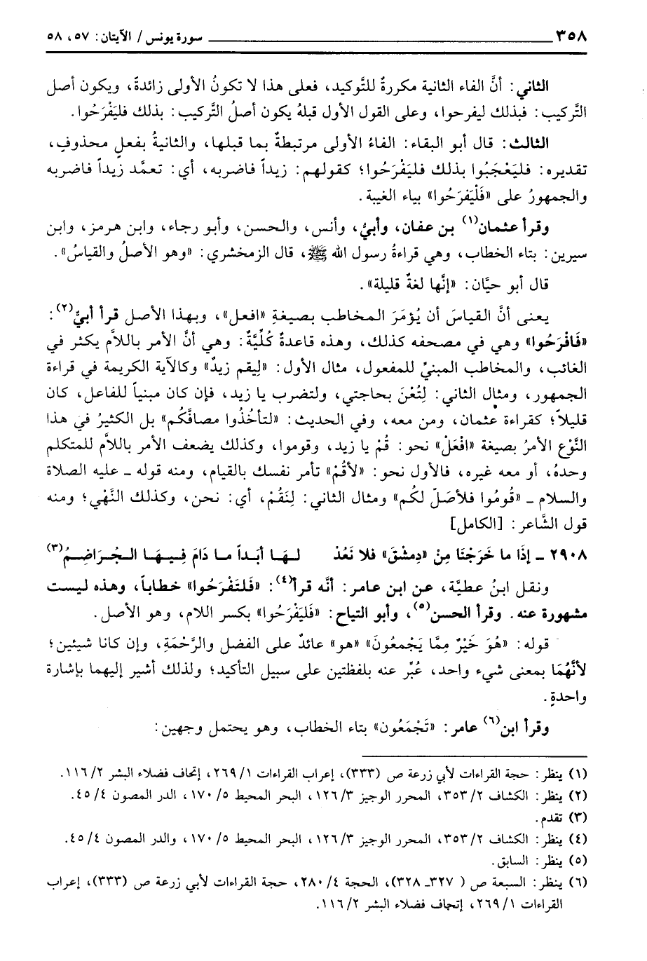 الثاني: أنَّ الفاء الثانية مكررةٌ للتَّوكيد، فعلى هذا لا تكونُ الأولى زائدةً، ويكون أصل التَّركيب: فبذلك ليفرحوا، وعلى القول الأول قبلهُ يكون أصلُ التَّركيب: بذلك فليَفْرَحُوا.