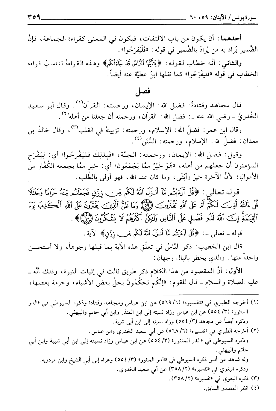 وقال ابن عمر: فضلُ الله: الإسلام، ورحمته: تزيينهُ في القلب، وقال خالدُ بن معدان: فضلُ الله: الإسلام، ورحمته: السُّنَن.