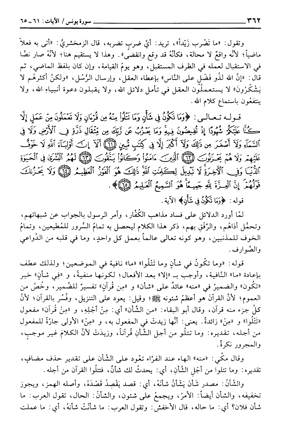 قوله: {وَمَا تَكُونُ فِي شَأْنٍ وَمَا تَتْلُواْ} «ما» نافية في الموضعين؛ ولذلك عطف بإعادة «ما» النَّافية، وأوجب ب «إلا» بعد الأفعال؛ لكونها منفيةٌ، و «فِي شَأنٍ» خبر «تكُون» والضميرُ في «منه» عائدٌ على «شأن» و «مِن قُرآنٍ» تفسيرٌ للضَّمير، وخُصَّ من العموم؛ لأنَّ القرآنَ هو أعظمُ شئونه صَلَّى اللَّهُ عَلَيْهِ وَسَلَّم َ؛ وقيل: يعود على التنزيل، وفُسِّر بالقرآن؛ لأنَّ كلَّ جزء منه قرآن، وقال أبو البقاء: «من الشَّأن» أي: مِنْ أجْلِهِ، و «مِنْ قُرآن» مفعول «تَتْلُوا» و «مِنْ» زائدةٌ. يعنى: أنَّها زيدتْ في المفعول به، و «مِنْ» الأولى جارَّةٌ للمفعول من أجله، تقديره: وما تتلُو من أجل الشَّأنِ قُرآناً، وزيدَتْ لأنَّ الكلامَ غير موجبٍ، والمجرور نكرةٌ.