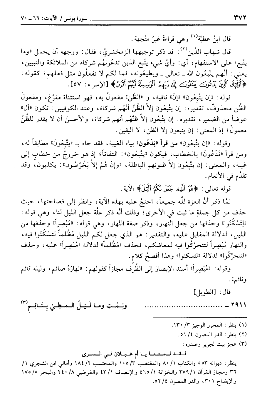 قوله: «إن يتَّبِعُون» «إنْ» نافية، و «الظَّن» مفعولٌ به، فهو استثناءٌ مفرَّغ، ومفعولُ الظَّن محذوفٌ، تقديره: إن يتَّبعُون إلاَّ الظَّنَّ أنَّهُم شركاءُ، وعند الكوفيين: تكون «أل» عوضاً من الضمير، تقديره: إن يتَّبعُون إلاَّ ظنَّهُم أنهم شركاءُ، والأحسنُ أن لا يقدر للظَّنِّ معمولٌ؛ إذ المعنى: إن يتبعون إلا الظن، لا اليقين.
