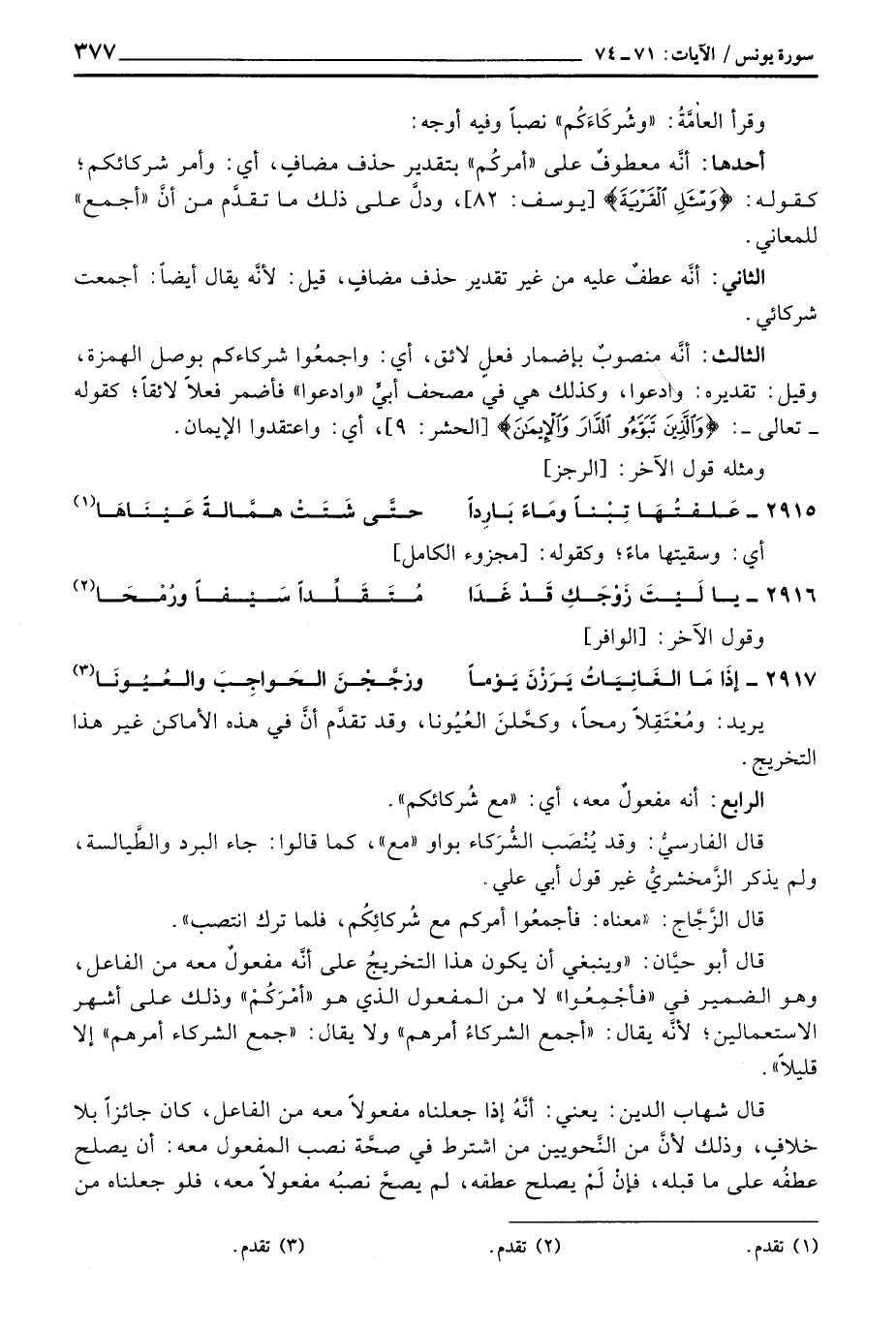 قال أبو حيَّان: «وينبغي أن يكون هذا التخريجُ على أنَّه مفعولٌ معه من الفاعل، وهو الضمير في» فأجْمِعُوا «لا من المفعول الذي هو» أمْرَكُمْ «وذلك ‘لى أشهر الاستعمالين؛ لأنَّه يقال:» أجمع الشركاءُ أمرهم «ولا يقال:» جمع الشركاء أمرهم «إلا قليلاً» .
