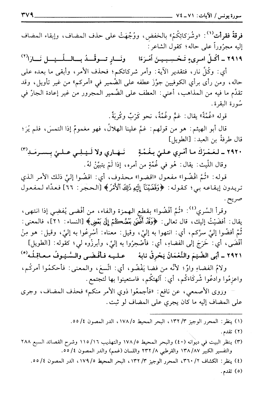 ولامُ الفضاءِ واوٌ؛ لأنَّه من فضا يَفْضُو، أي: اتَّسعَ، والمعنى: فأحكمُوا أمركُم، واعزِمُوا وادعُوا شُركَاءَكُم، أي: آلهتكُم، فاستعينوا بها لتجتمع.
