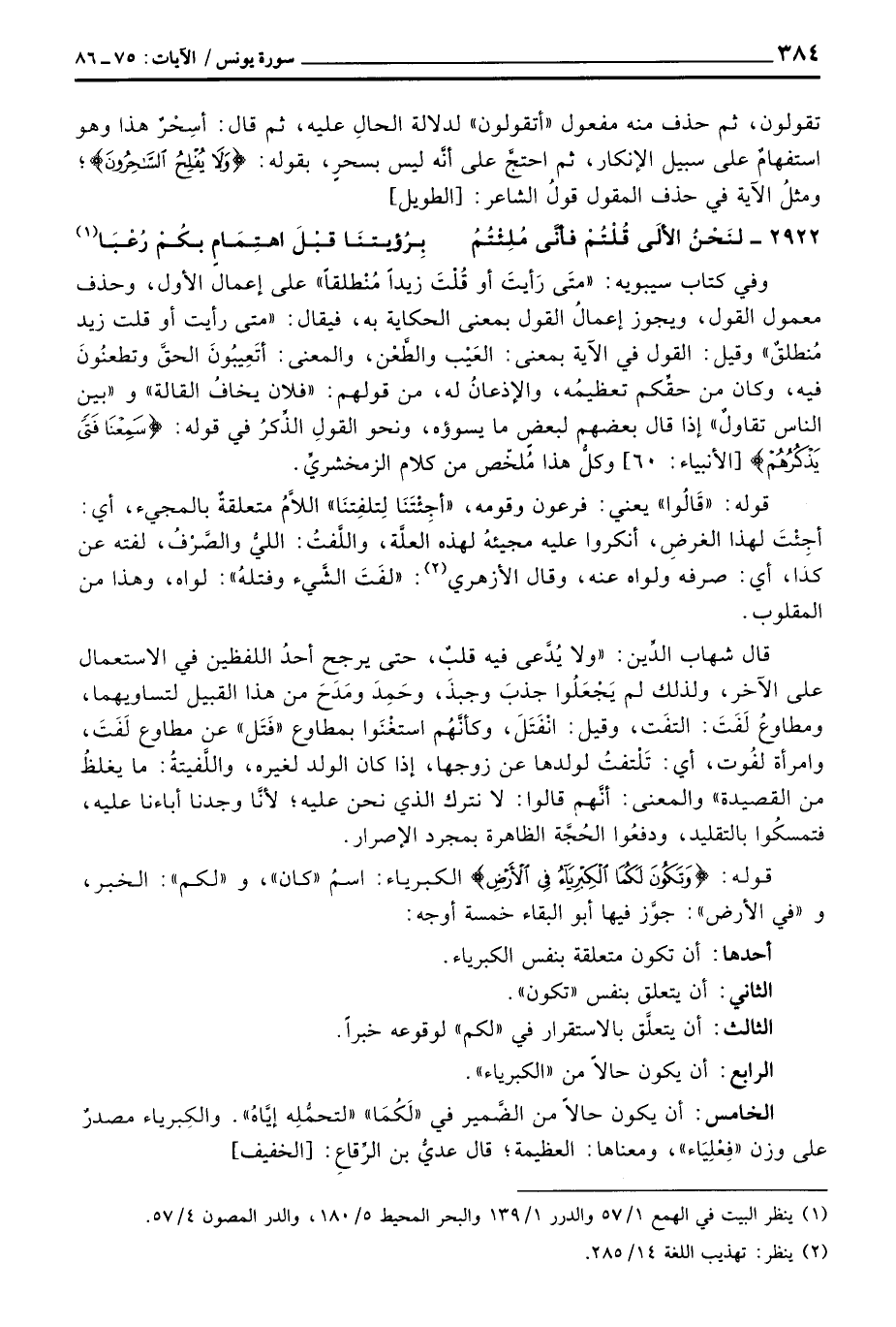 الخامس: أن يكون حالاً من الضَّمير في «لَكُمَا» لتحمُّلِه إيَّاهُ «. والكبرياء مصدرٌ على وزن» فِعْلِيَاء «، ومعناها: العظيمة؛ قال عديُّ بن الرِّقَاعِ: [الخفيف]