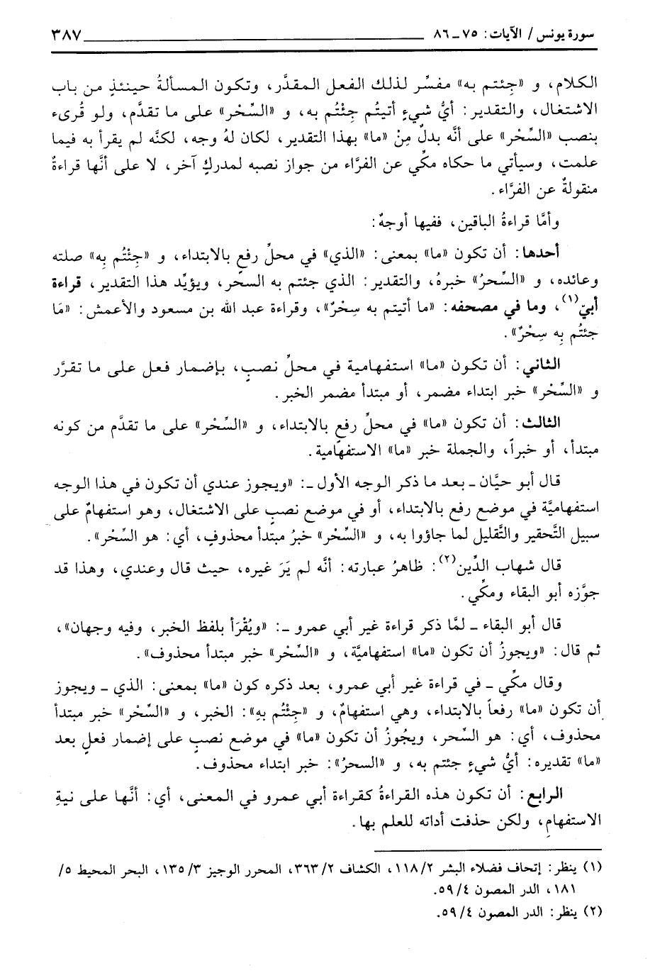 قال أبو حيَّان - بعد ما ذكر الوجه الأول -: «ويجوز عندي أن تكون في هذا الوجه استفهاميَّة في موضع رفع بالابتداء، أو في موضع نصبٍ على الاشتغال، وهو استفهامٌ على سبيل التَّحقير، والتَّقليل لما جاؤوا به، و» السِّحْر «خبرُ مبتدأ محذوفٍ، أي: هو السِّحْر» .