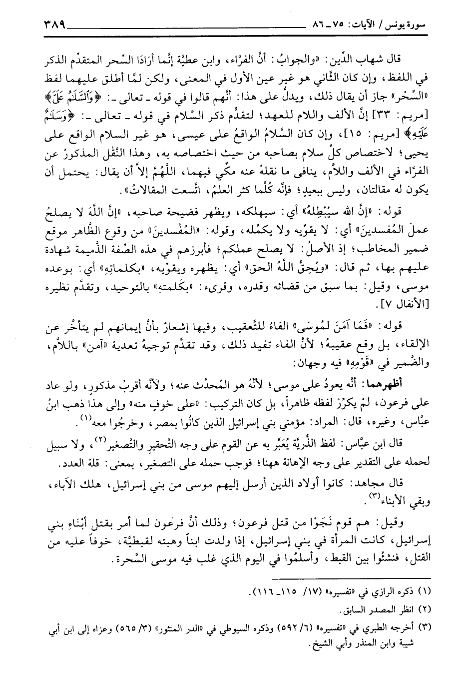 قال شهاب الدِّين: «والجوابُ: أنَّ الفرَّاء، وبن عطيَّة إنَّما أرَادَا السِّحر المتقدِّم الذكر في اللفظ، وإن كان الثَّاني هو غير عين الأول في المعنى، ولكن لمَّا أطلق عليهما لفظ» السَّحْر «جاز أن يقال ذلك، ويدلُّ على هذا: أنَّهم قالوا في قوله - تعالى -: {والسلام عَلَيَّ} [مريم: 33] إنَّ الألف واللام للعهد؛ لتقدُّم ذكر السَّلام في قوله - تعالى -: {وَسَلاَمٌ عَلَيْهِ} [مريم: 15] ، وإن كان السَّلامُ الواقعُ على عيسى، هو غير السلام الواقع على يحيى؛ لاختصاص كلِّ سلام بصاحبه من حيث اختصاصه به، وهذا النَّقْل المذكورُ عن الفرَّاء في الألف واللاَّم، ينافى ما نقلهُ عنه مكِّي فيهما، اللَّهُمَّ إلاَّ أن يقال: يحتمل أن يكون له مقالتان، وليس ببعيدٍ؛ فإنَّه كُلَّما كثر العلمُ، اتَّسعت المقالاتُ» .