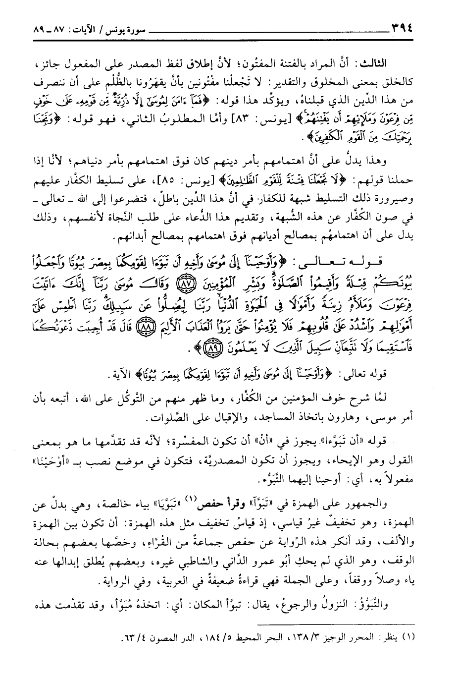 والجمهور على الهمزة في «تَبَوَّآ» وقرأ حفص «تَبَوَّيَا» بياء خالصة، وهي بدلٌ عن الهمزة، وهو تخفيفٌ غيرُ قياسي، إذ قياسُ تخفيف مثل هذه الهمزة: أن تكون بين الهمزة والألف، وقد أنكر هذه الرِّواية عن حفص جماعةٌ من القُرَّاءِ، وخصَّها بعضهم بحالة الوقف، وهو الذي لم يحكِ أبُو عمرو الدَّاني والشاطبي غيره، وبعضهم يُطلق إبدالها عنه ياء وصلاً ووقفاً، وعلى الجملة فهي قراءةٌ ضعيفةٌ في العربية، وفي الرواية.