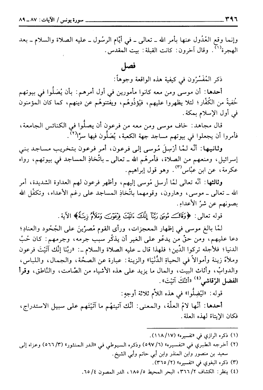 وثالثها: أنَّه تعالى لمَّا أرسل مُوسى إليهم، وأظهر فرعون لهم العداوة الشديدة، أمر الله - تعالى - موسى، وهارون، وقومهما باتِّخاذِ المساجد على رغم الأعداء، وتكفَّل الله بصونهم عن شرِّ الأعداءِ.