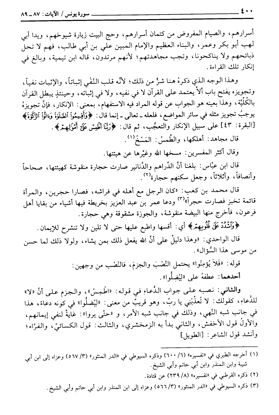 وهذا الوجه الذي ذكرهُ هنا شرٌّ من ذلك؛ لأنَّه قلب النَّفي إثباتاً، والإثبات نفياً، وتجويزه بفتح باب ألاَّ يعتمد على القرآن لا في نفيه، ولا في إثباته، وحينئذٍ يبطل القرآن بالكُلِّيَّة، وهذا بعينه هو الجواب عن قوله المراد فيه الاستفهام، بمعنى: الإنكار، فإنَّ تجويزهُ يوجبُ تجويز مثله في سائر المواضع، فلعله - تعالى - إنما قال: {وَأَقِيمُواْ الصلاة وَآتُواْ الزكاة} [البقرة: 43] على سبيل الإنكار والتعجُّب، ثم قال: {رَبَّنَا اطمس على أَمْوَالِهِمْ} .