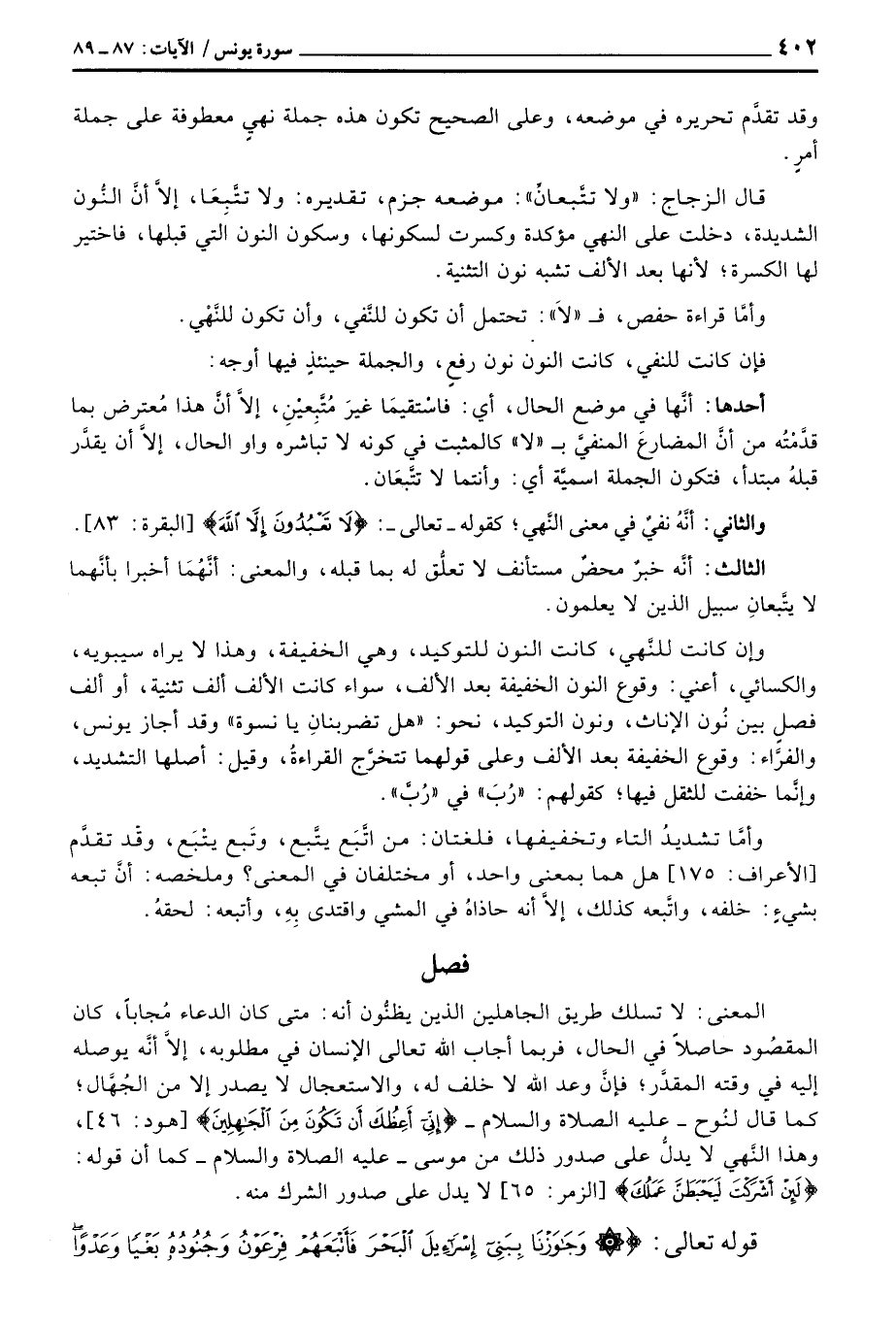 قال الزجاج: «ولا تتَّبعانِّ» : موضعه جزم، تقديره: ولاتتَّبِعَا، إلاَّ أنَّ النُّون الشديدة، دخلت على النهي مؤكدة وكسرت لسكونها، وسكون النون التي قبلها، فاختير لها الكسرة، لأنها بعد الألف تشبه نون التثنية.