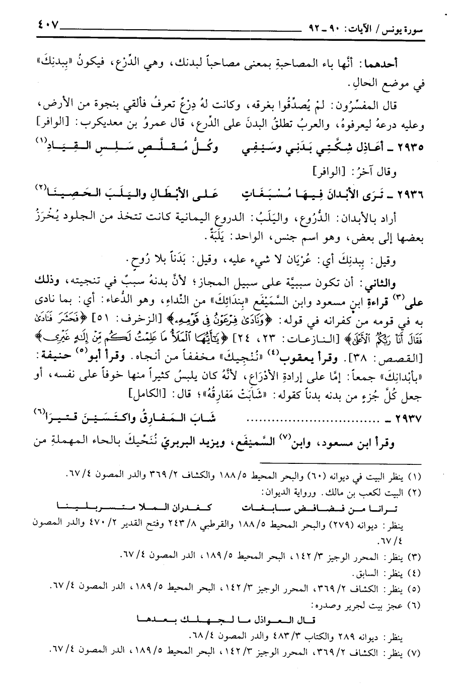 قال المفسِّرُون: لمْ يُصدِّقُوا بغرقه، وكانت لهُ دِرْعٌ تعرفُ فألقي بنجوة من الأرض، وعليه درعهُ ليعرفوهُن والعربُ تطلقُ البدنَ على الدِّرع، قال عمرو بن معد يكرب: [الوافر]