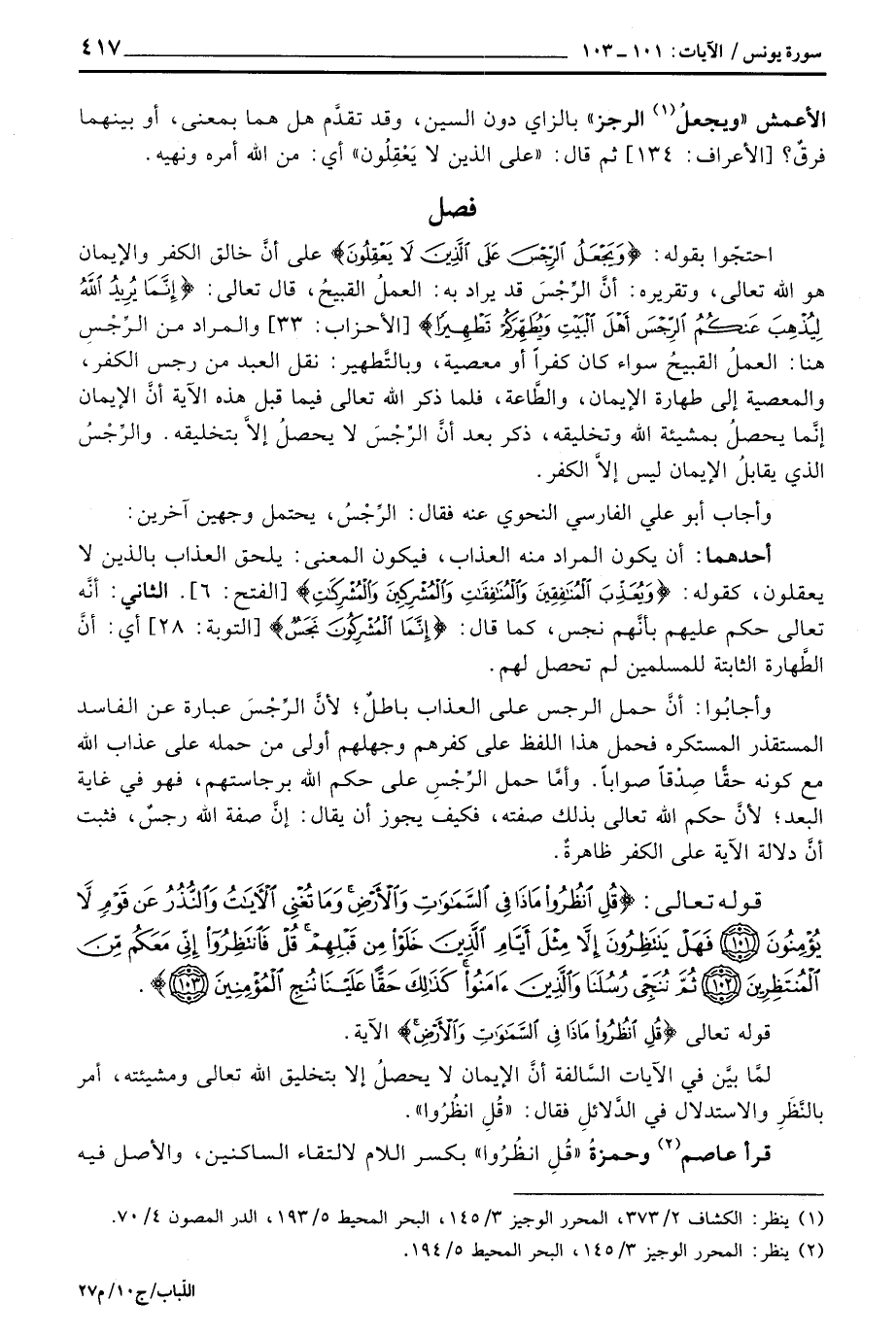 وأجابُوا: أنَّ حمل الرجس على العذاب باطلٌ؛ لأنَّ الرِّجْسَ عبارة عن الفاسد المستقذر المستكره فحمل هذا اللفظ على كفرهم وجهلهم أولى من حمله على عذاب الله مع كونه حقّاً صِدْقاً صواباً. وأمَّا حمل الرِّجْسِ على حكم الله برجاستهم، فهو في غاية البعد؛ لأنَّ حكم الله تعالى بذلك صفته، فكيف يجوز أن يقال: إنَّ صفة الله رجسٌ، فثبت أنَّ دلالة الآية على الكفر ظاهرةٌ.