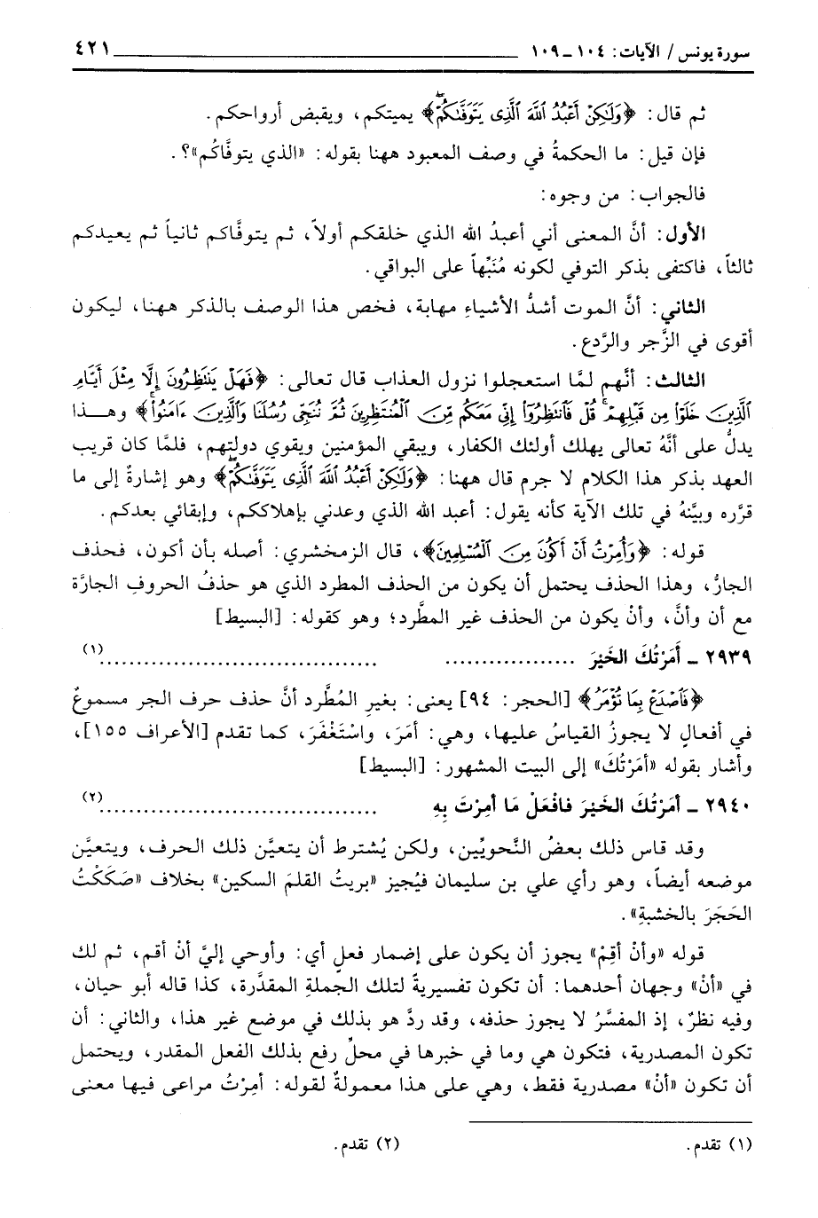 قوله: {وَأُمِرْتُ أَنْ أَكُونَ مِنَ المسلمين} [يونس: 72] ، قال الزمخشري: أصله بأن أكون، فحذف الجارُّ، وهذا الحذف يحتمل أن يكون من الحذف المطرد الذي هو حذفُ الحروفِ الجارَّة مع أن وأنَّ، وأنْ يكون من الحذف غير المطَّرد؛ وهو كقوله: [البسيط]