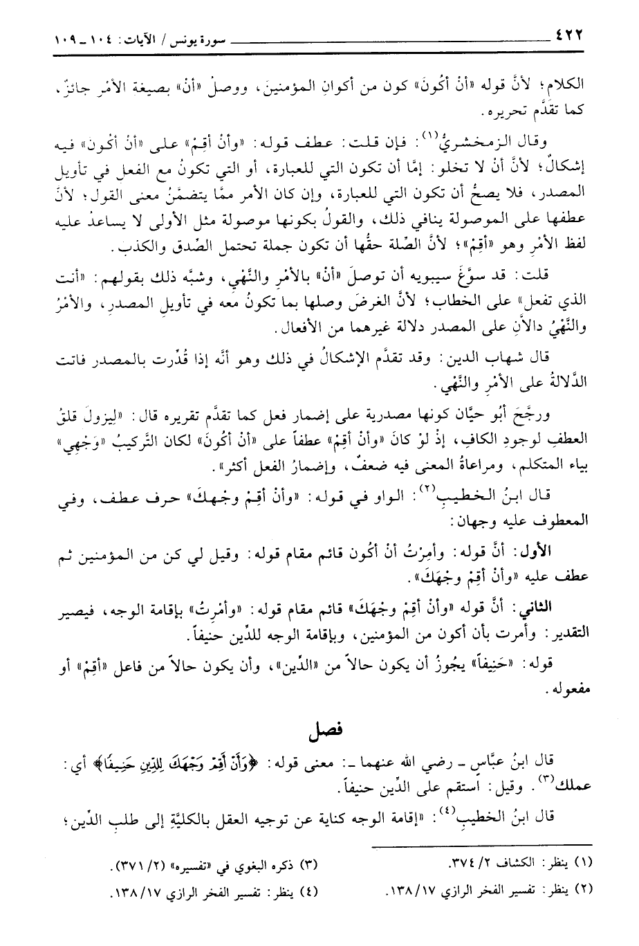 ورجَّحَ أبُو حيَّان كونها مصدرية على إضمار فعل كما تقدَّم تقريره قال: «ليزولَ قلقُ العطفِ لوجودِ الكافِ، إذْ لوْ كانَ» وأنْ أقِمْ «عفطاص على» أنْ أكُونَ «لكان التَّركيبُ» وَجْهِي «بياء المتكلم، ومراعاةُ المعنى فيه ضعفٌ، وإضمارُ الفعل أكثر» .