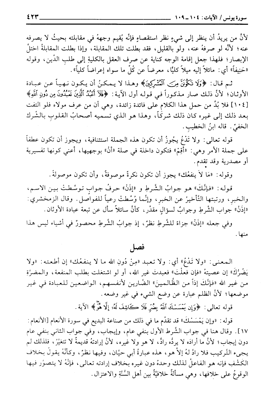 ثم قال: {وَلاَ تَكُونَنَّ مِنَ المشركين} وهذا لا يمكنُ أن يكون نهياً عن عبادة الأوثان؛ لأنَّ ذلك صار مذكوراً في قوله أول الآية: {فَلاَ أَعْبُدُ الذين تَعْبُدُونَ مِن دُونِ الله} [104] فلا بُدَّ من حمل هذا الكلام على فائدة زائدة، وهي أن من عرف مولاه فلو التفت بعد ذلك إلى غيره كان ذلك شركاً، وهذا هو الذي تسميه أصحابُ القلوبِ بالشِّرك الخفيِّ. قاله ابنُ الخطيبِ.