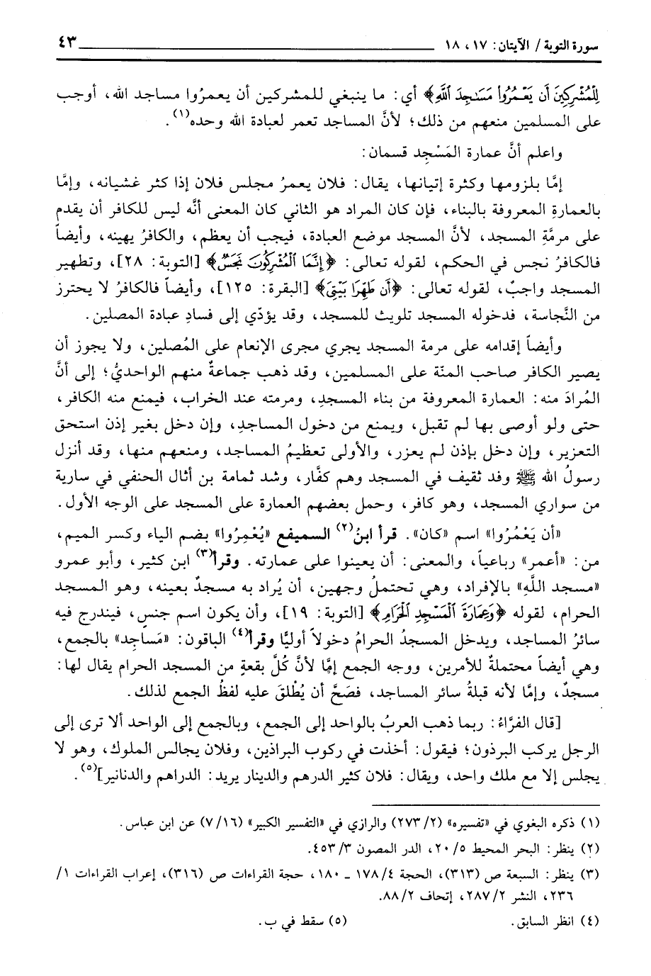 «أَن يَعْمُرُواْ» اسم «كان» . قرأ ابنُ السميفع «يُعْمِرُوا» بضم الياء وكسر الميم، من: «أعمر» رباعياً، والمعنى: أن يعينوا على عمارته. وقرأ ابن كثير، وأبو عمرو «مسجد اللهِ» بالإفراد، وهي تحتملُ وجهين، أن يُراد به مسجدق بعينه، وهو المسجد الحرام، لقوله {وَعِمَارَةَ المسجد الحرام} [التوبة: 19] ، وأن يكون اسم جنسٍ، فيندرج فيه سائر المساجد، ويدخل المسجدُ الحرامُ دخولاً أوليّاً وقرأ الباقون: «مَساجِد» بالجمع، وهي أيضاً محتملةٌ للأمرين، ووجه الجمع إمَّا لأنَّ كُلَّ بقعةٍ من المسجد الحرام يقال لها: مسجدٌ، وإمَّا لأنه قبلةُ سائر المساجد، فصَحَّ أن يُطْلقَ عليه لفظُ الجمع لذلك.