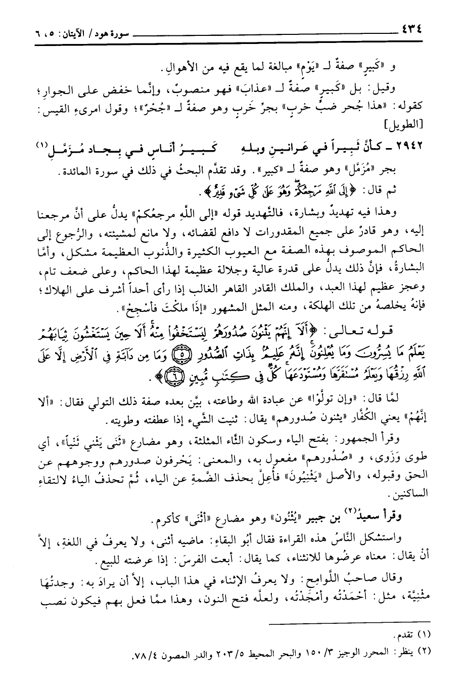 وقرأ الجمهور: بفتح الياء وسكون الثَّاء المثلثة، وهو مضارع «ثَنَى يَثْني ثَنْياً» ، أي طوى وَزَوى، و «صُدُورهم» مفعول به، والمعنى: يَحْرفون صدورهم ووجوههم عن الحق وقبوله، والأصل «يَثْنِيُونَ» فأُعِلَّ بحذف الضَّمةِ عن الياء، ثُمَّ تحذفُ الياءُ لالتقاءِ الساكنين.