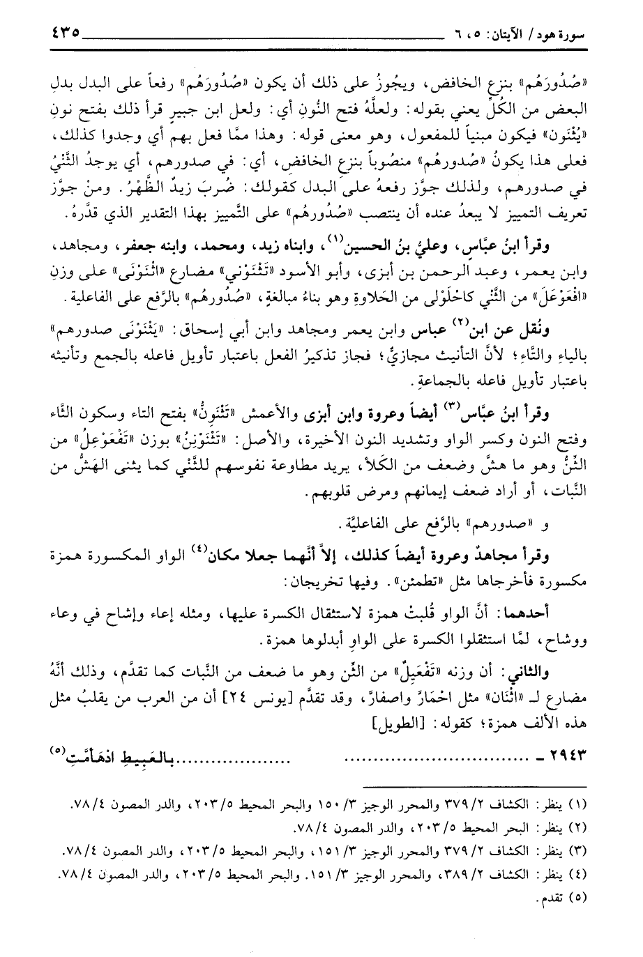وقرأ ابنُ عبَّاسٍ، وعليُّ بنُ الحسين، وابناه زيد، ومحمد، وابنه جعفر، ومجاهد، وابن يعمر، وعبد الرحمن بن أبزى، وأبو الأسود «تَثنَوْني» مضارع «اثْنَوْنَى» على وزنِ «افْعَوْعَلَ» من الثَّنْي كاحْلَوْلى من الحَلاوةِ وهو بناءُ مبالغةٍ، «صُدُورهُم» بالرَّفع على الفاعلية.