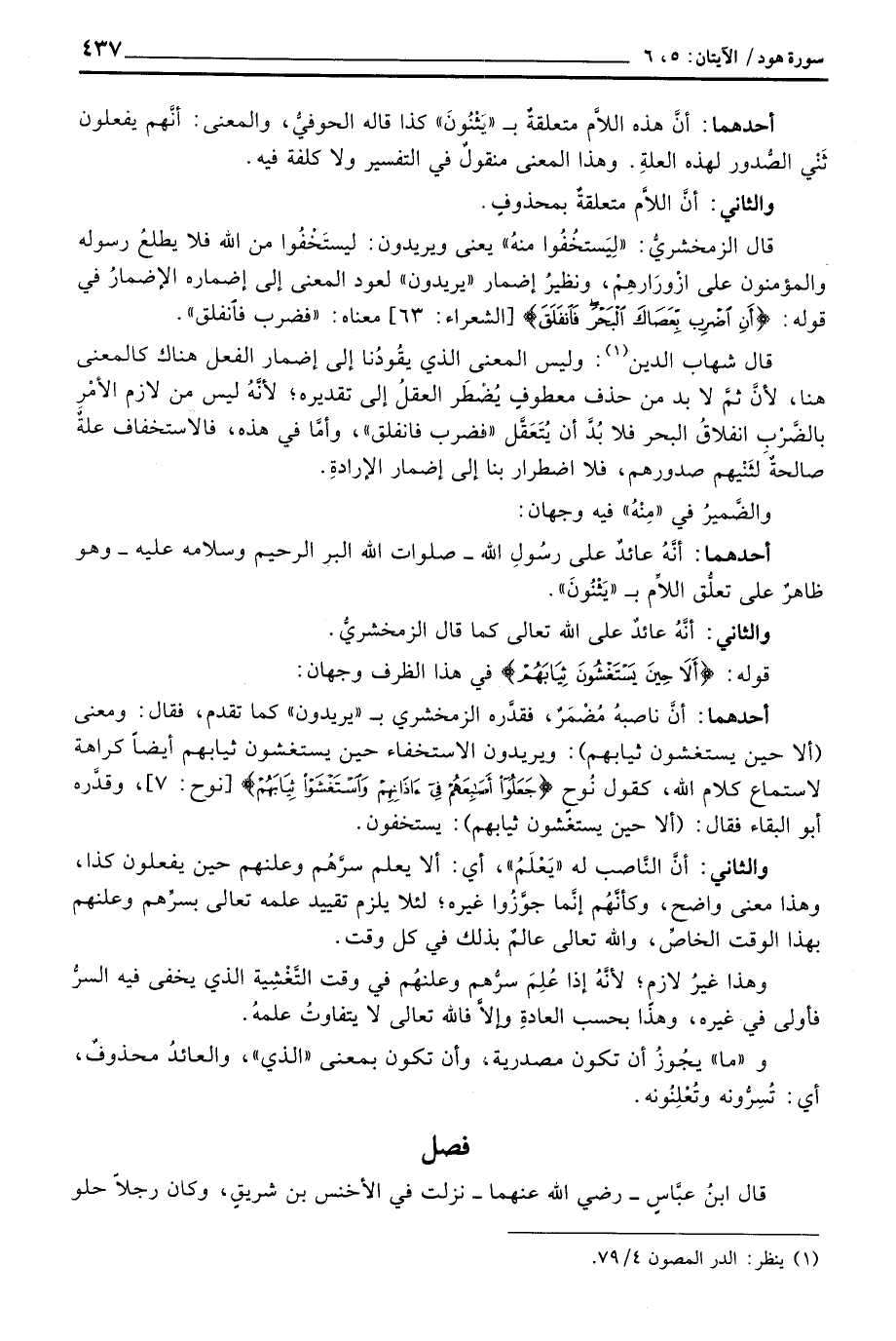 قال شهاب الدين: وليس المعنى الذي يقُودُنا إلى إضمار الفعل هناك كالمعنى هنا، لأنَّ ثمَّ لا بد من حذف معطوفٍ يُضْطَر العقلُ إلى تقديره؛ لأنَّهُ ليس من لازم الأمْرِ بالضَّرْبِ إنفلاقُ البحر فلا بُدَّ أن يُتَعَقَّل «فضرب فانفلق» ، وأمَّا في هذه، فالاستخفاف علةٌ صالحةٌ لثَنْيهم صدورهم، فلا اضطرار بنا إلى إضمار الإرادةِ.