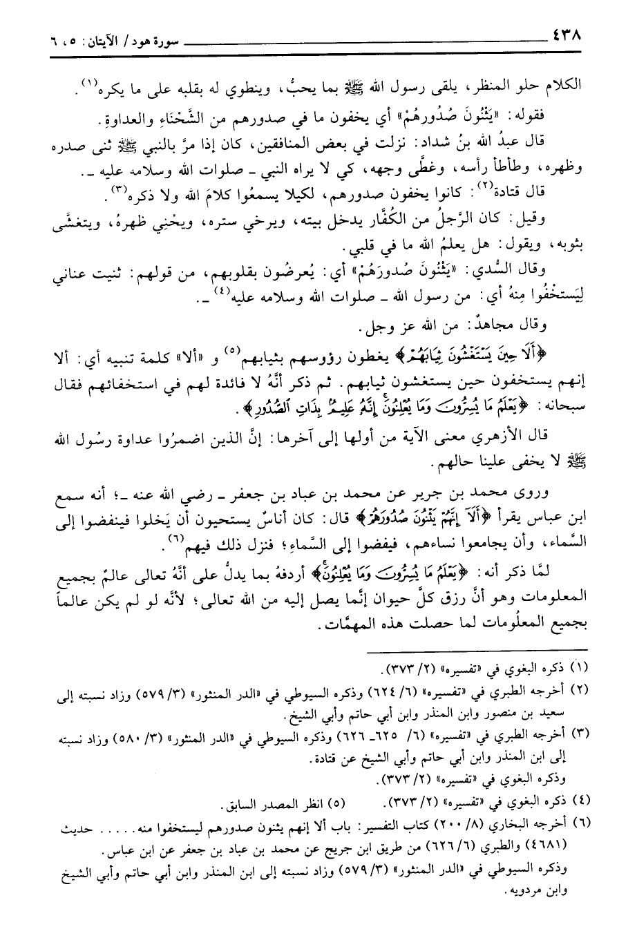 وروى محمد بن جرير عن محمد بن عباد بن جعفر - رَضِيَ اللَّهُ عَنْه -؛ أنه سمع ابن عباس يقرأ {أَلا إِنَّهُمْ يَثْنُونَ صُدُورَهُمْ} قال: كان أناسٌ يستحيون أن يَخلوا فينفضوا إلى السَّماء، وأن يجامعوا نساءهم، فيفضوا إلى السَّماءِ؛ فنزل ذلك فيهم.