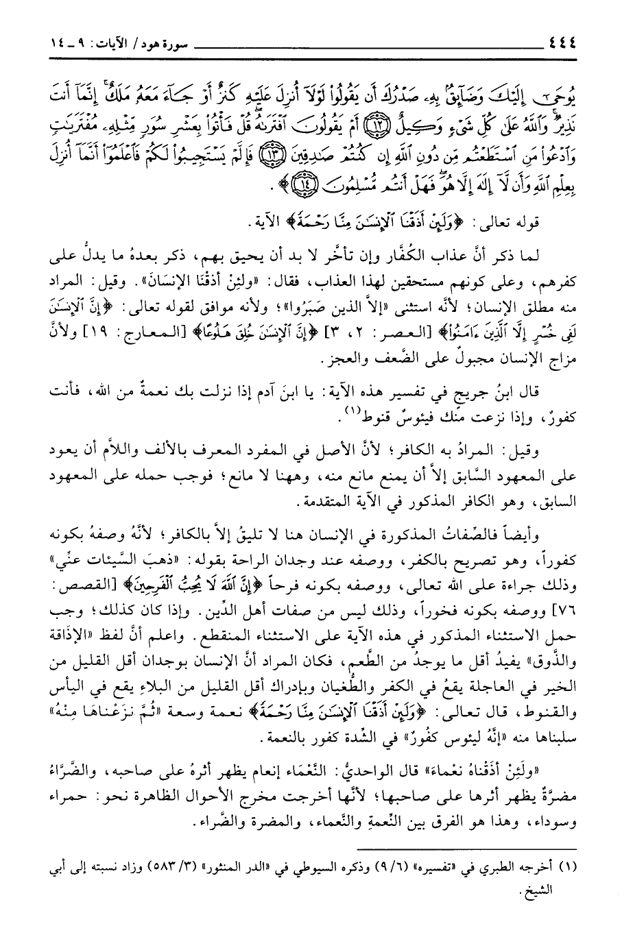 وأيضاً فالصِّفاتُ المذكورة في الإنسان هنا لا تليقُ إلاَّ بالكافر؛ لأنَّهُ وصفهُ بكونه كفوراً، وهو تصريح بالكفر، ووصفه عند وجدان الراحة بقوله: {ذَهَبَ السيئات عنيا} وذلك جزاءة على الله تعالى، ووصفه بكونه فرحاً {إِنَّ الله لاَ يُحِبُّ الفرحين} [القصص: 76] وصفه بكونه فخوراً، وذلك ليس من صفات أهل الدِّين. وإذا كان كذلك؛ وجب حمل الاستثناء المذكور في هذه الآية على الاستثناء المنقطع. واعلم أنَّ لفظ «الإذَاقة والذَّوق» يفيدُ أقل ما يوجدُ من الطَّعم، فكان المراد أنَّ الإنسان بوجدان أقل القليل من الخير في العاجلة يقعُ في الكفر والطُّغيان وبإدراك أقل القليل من البلاءِ يقع في اليأس والقنوط، قال تعالى: {وَلَئِنْ أَذَقْنَا الإنسان مِنَّا رَحْمَةً} نعمة وسعة {ثُمَّ نَزَعْنَاهَا مِنْهُ} سلبناها منه {إِنَّهُ لَيَئُوسٌ كَفُورٌ} في الشِّدة كفور بالنعمة.