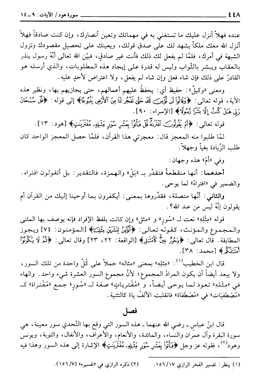 قال ابن الخطيب:» مِثلِهِ «بمعنى» مثاله «حملاً على كُلِّ واحدة من تلك السور، ولا يبعد أيضاً أن يكون المرادُ المجموع؛ لأنَّ مجموع السور العشرة شيء واحد. والهاء في» مِثْلِهِ «تعود لما يوحى أيضاً، و» مُفْترياتٍ «صفة ل» سُورٍ «جمع» مُفْتراة «ك» مُصْطفيَات «في» مُصْطَفاة «فانقلبت الألفُ ياءً كالتثنية.