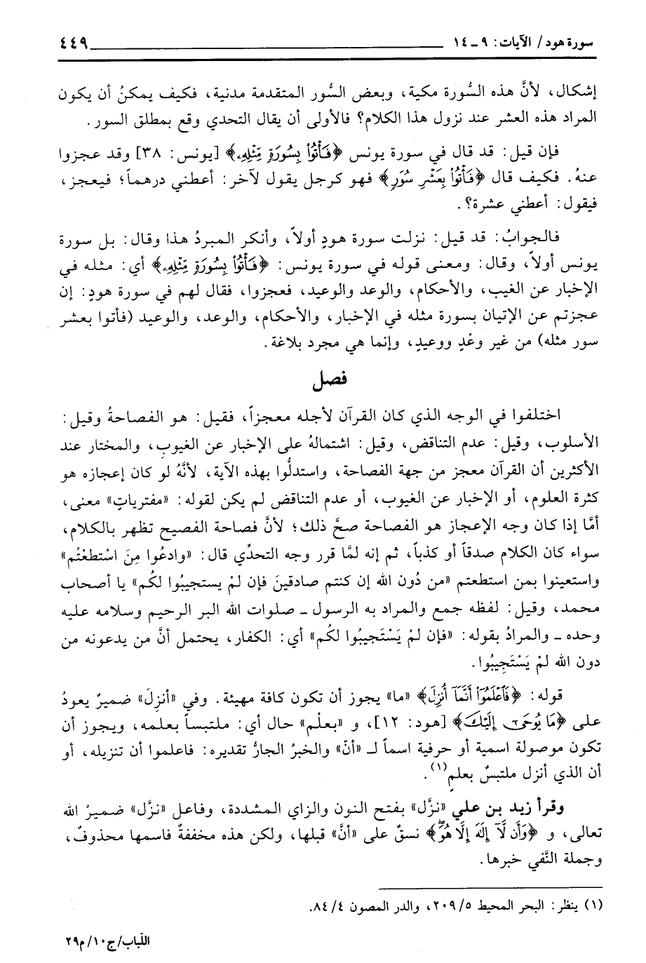 اختلفوا في الوجه الذي كان القرآن لأجله معجزاً، فقيل: هو الفصاحةُ وقيل: الأسلوب، وقيل: عدم التناقض، وقيل: اشتمالهُ على الإخبار عن الغيوبِ، والمختار عند الأكثرين أن القرآن معجز من جهة الفصاحة، واستدلُّوا بهذه الآية، لأنَّهُ لو كان إعجازه هو كثرة العلوم، أو الإخابر عن الغيوب، أو عدم التناقض لم يكن لقوله: «مفترياتٍ» معنى، أمَّا إذا كان وجه الإعجاز هو الفصاحة صحَّ ذلك؛ لأنَّ فصاحة الفصيح تظهر بالكلام، سواء كان الكلام صدقاً أو كذباً، ثم إنه لمَّا قرر وجه التحدِّي قال: {وادعوا مَنِ استطعتم} واستعينوا بمن استطعتم {وادعوا مَنِ استطعتم مِّن دُونِ الله إِن كُنتُمْ صَادِقِينَ فَإِلَّمْ يَسْتَجِيبُواْ لَكُمْ} يا أصحاب محمد، وقيل: لفظه جمع والمراد به الرسول - صلوات الله البر الرحيم وسلامه عليه وحده - والمرادُ بقوله: {فَإِلَّمْ يَسْتَجِيبُواْ لَكُمْ} أي: الكفار، يحتمل أنَّ من يدعونه من دون الله لمْ يَسْتَجِيبُوا.