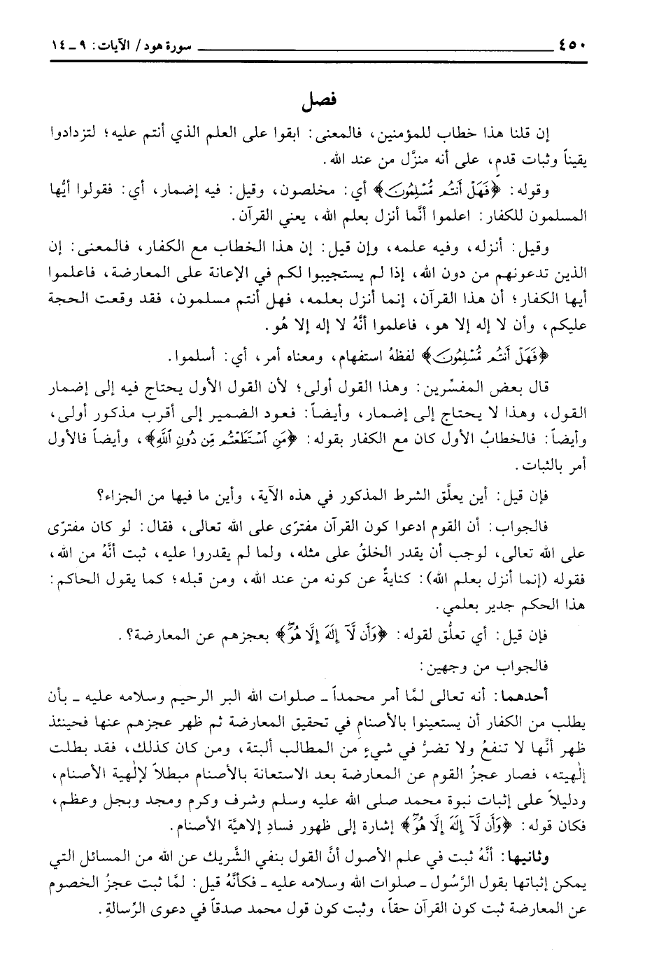 فالجواب: أن القوم ادعوا كون القرآن مفترًى على الله تعالى، فقال: لو كان متفرًى على الله تعالى، لوجب أن يقدر الخلقُ على مثله، ولما لم يقدروا عليه، ثبت أنَّهُ من الله، فقوله (إنا أنزل بعلم الله) : كنايةٌ عن كون من عند الله، ومن قبله؛ كما يقول الحاكم: هذا الحكم جدير بعلمي.