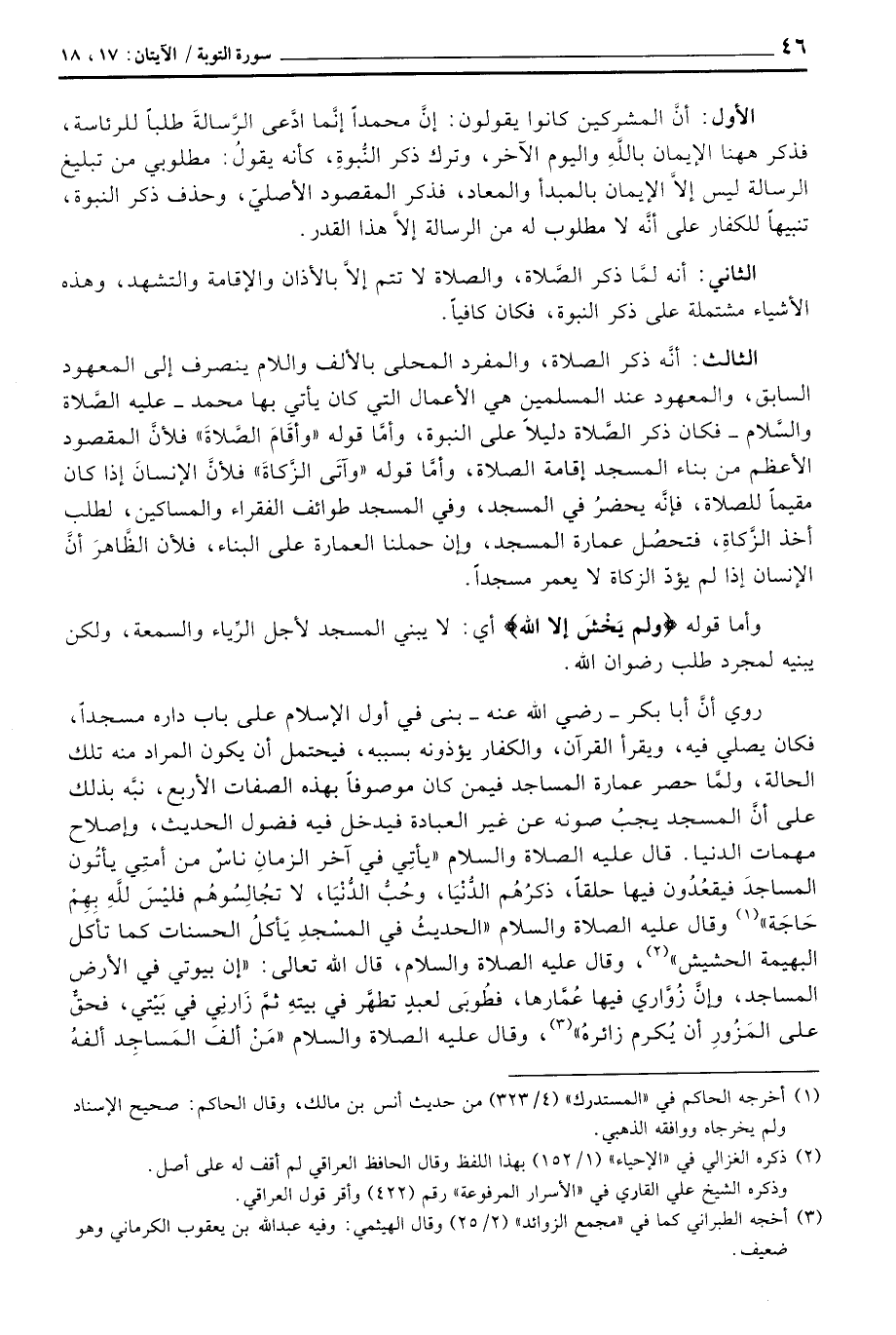 روي أنَّ أبا بكر - رَضِيَ اللَّهُ عَنْه - بنى في أول الإسلام على باب داره مسجداً، فكان يصلي فيه، ويقرأ القرآن، والكفار يؤذونه بسببه، فيحتمل أن يكون المراد منه تلك الحالة، ولمَّا حصر عمارة المساجد فيمن كان موصوفاً بهذه الصفات الأربع، نبَّه بذلك على أنَّ المسجد يجبُ صونه عن غير العبادة فيدخل فيه فضول الحديث، وإصلاح مهمات الدنيا. قال عَلَيْهِ الصَّلَاة وَالسَّلَام ُ: «يأتِي في آخر الزمانِ ناسٌ من أمتِي يأتُون المساجدَ فيقعُدُون فيها حلقاً، ذكرُهُم الدُّنْيَا، وحُبُّ الدُّنْيَا، لا تُجالِسُوهُم فليْسَ للهِ بِهِمْ حَاجَة» وقال عَلَيْهِ الصَّلَاة وَالسَّلَام ُ «الحديثُ في المسْجِدِ يَأكلُ الحسنات كما تأكل البهيمة الحشيش» ، وقال عَلَيْهِ الصَّلَاة وَالسَّلَام ُ، قال الله تعالى: «إن بيوتي في الأرض المساجد، وإنَّ زُوَّاري فيها عُمَّارها، فطُوبَى لعبدٍ تطهَّر في بيتهِ ثمَّ زَارنِي في بَيْتِي، فحقٌّ على المَزُورِ أن يُكرم زائرهُ» ، وقال عَلَيْهِ الصَّلَاة وَالسَّلَام ُ «مَنْ ألفَ المَساجِد ألفهُ