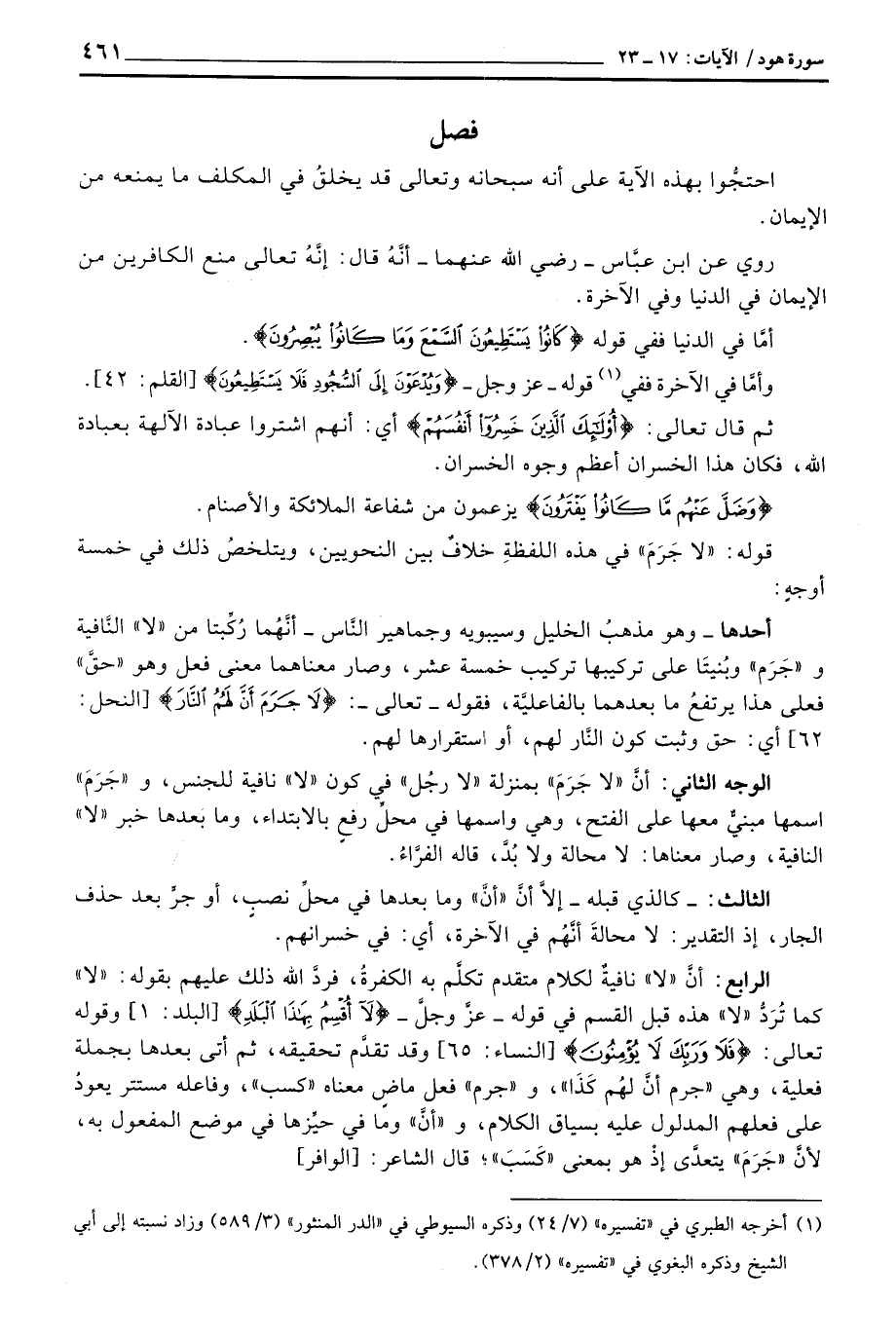 قوله: «لا جَرَمَ» في هذه اللفظةِ خلافٌ بين النحويين، ويتلخصُ ذلك في خمسة أوجهٍ: