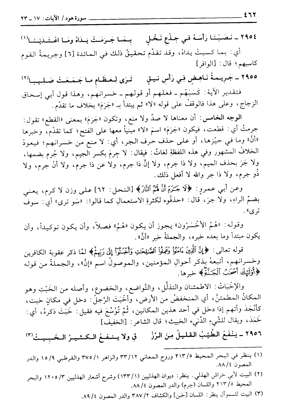 الوجه الخامس: أن معناها لا صدَّ ولا منع، وتكون «جَرَمَ» بمعنى «القطع» تقول: جرمتُ أي: قطعت، فيكون «جَرَمَ» اسمَ «لا» مبنياً معها على الفتح؛ كما تقدَّم، وخبرها «أنَّ وما في حيِّزها، أو على حذف حرف الجر، أي: لا منع من خسرانهم؛ فيعودُ الخلافُ المشهور وفي هذه اللفظةِ لغاتٌ: فيقال: لا جِرمَ بكسر الجمي، ولا جُرم بضمها، ولا جَرَ بحذف الميم، ولا ذا جرم، ولا إنَّ ذا جرم، ولا عن ذا جرم، ولا أنْ جرم، ولا ذُو جرم، ولا ذا جر والله لا أفعل ذلك.