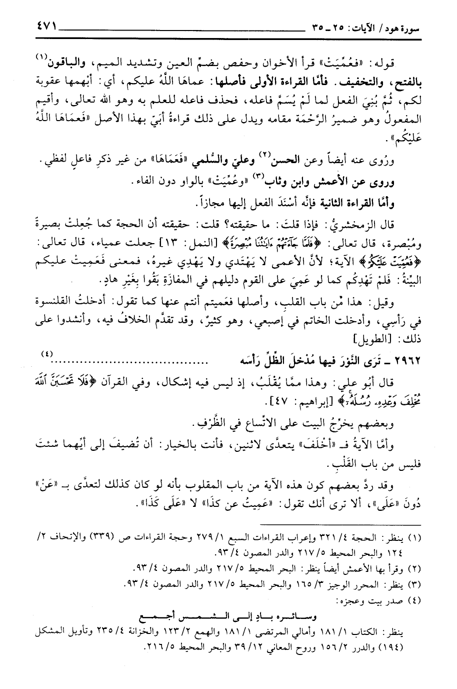 قوله: «فَعُمِّيَتْ» قرأ الأخوان وحفص بضمِّ العين وتشديد الميم، والباقون بالفتح، والتخفيف. فأمَّا القراءة الأولى فأصلها: عماهَا اللهُ عليكم، أي: أبْهمها عقوبة لكم، ثُمَّ بُنِيَ الفعل لما لَمْ يُسَمَّ فاعله، فحذف فاعله للعلم به وهو الله تعالى، وأقيم المفعولُ وهو ضميرُ الرَّحْمَة مقامه ويدل على ذلك قراءةُ أبَيّ بهذا الأصل «فَعمَاهَا اللهُ عَليْكُم» .