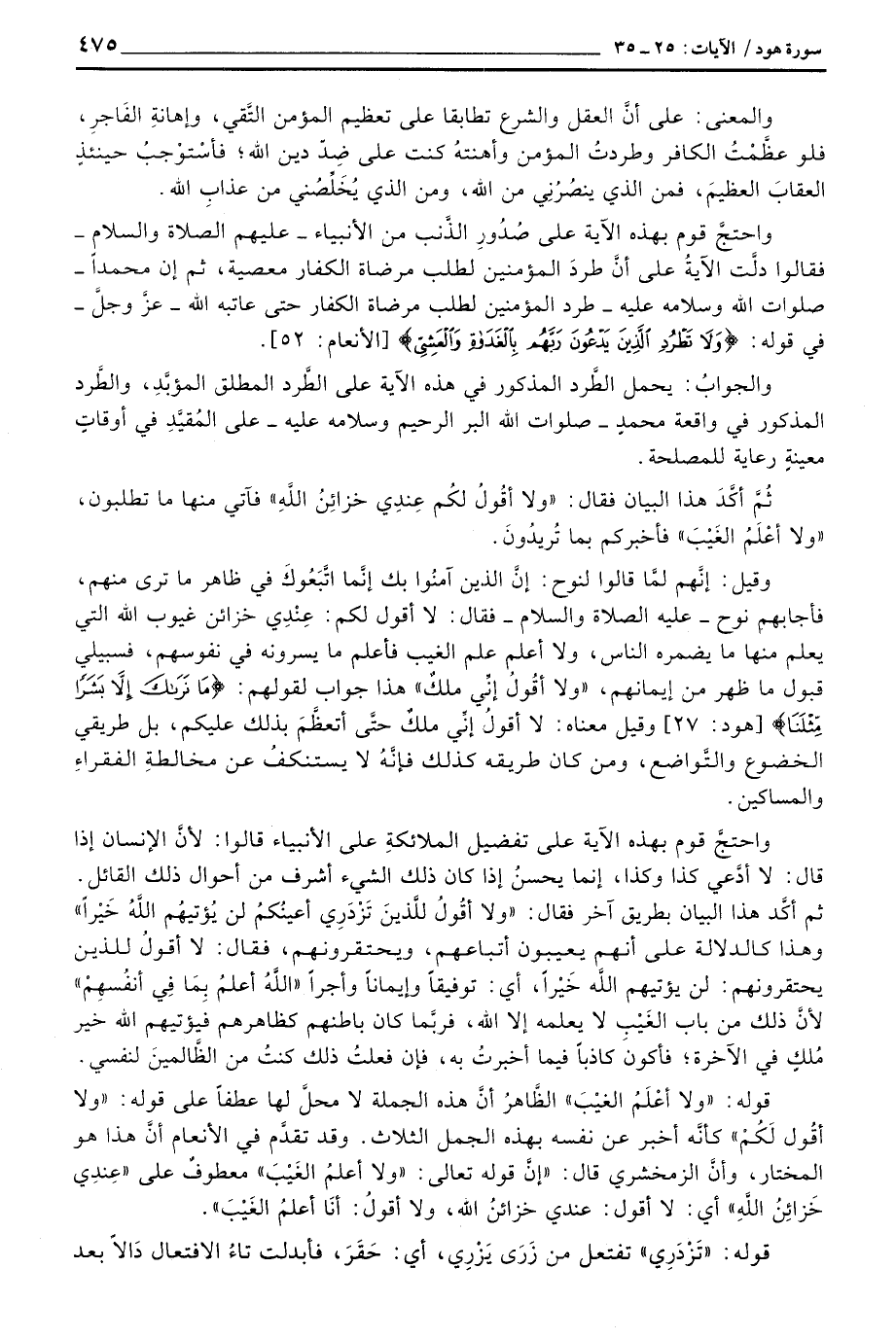 واحتجَّ قوم بهذه الآية على تفضيل الملائكةِ على الأنبياء قالوا: لأنَّ الإنسان إذا قال: لا أدَّعي كذا وكذا، إنما يحسنُ إذا كان ذلك الشيء أشرف من أحوال ذلك القائل. ثم أكَّدَ هذا البيان بطريق آخر فقال: {وَلاَ أَقُولُ لِلَّذِينَ تزدري أَعْيُنُكُمْ لَن يُؤْتِيَهُمُ الله خَيْراً} وهذا كالدلالة على أنهم يعيبون أتباعهم، ويحتقرونهم، فقال: لا أقولُ للذين يحتقرونهم: لن يؤتيهم الله خَيْراً، أي: توفيقاً وإيماناً وأجراً {الله أَعْلَمُ بِمَا فِي أَنْفُسِهِمْ} لأنَّ ذلك من باب الغَيْبِ لا يعلمه إلا الله، فربَّما كان باطنهم كظاهرهم فيؤتيهم الله خير مُلكٍ في الآخرة؛ فأكون كاذباً فيما أخبرتُ به، فإن فعلتُ ذلك كنتُ من الظَّالمينَ لنفسي.